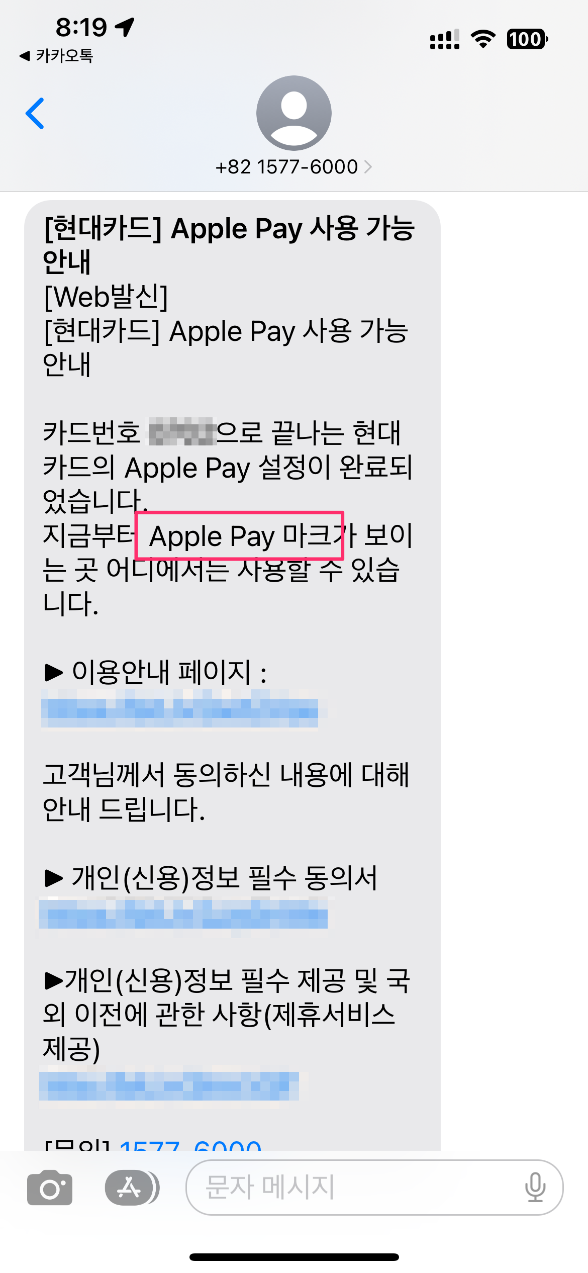 그리고 문자메시지가 도착했네요... ㅎㅎㅎ 지금부터 Apple Pay 마크가 보이는 곳 어디에서든 사용할 수 있다는데....
