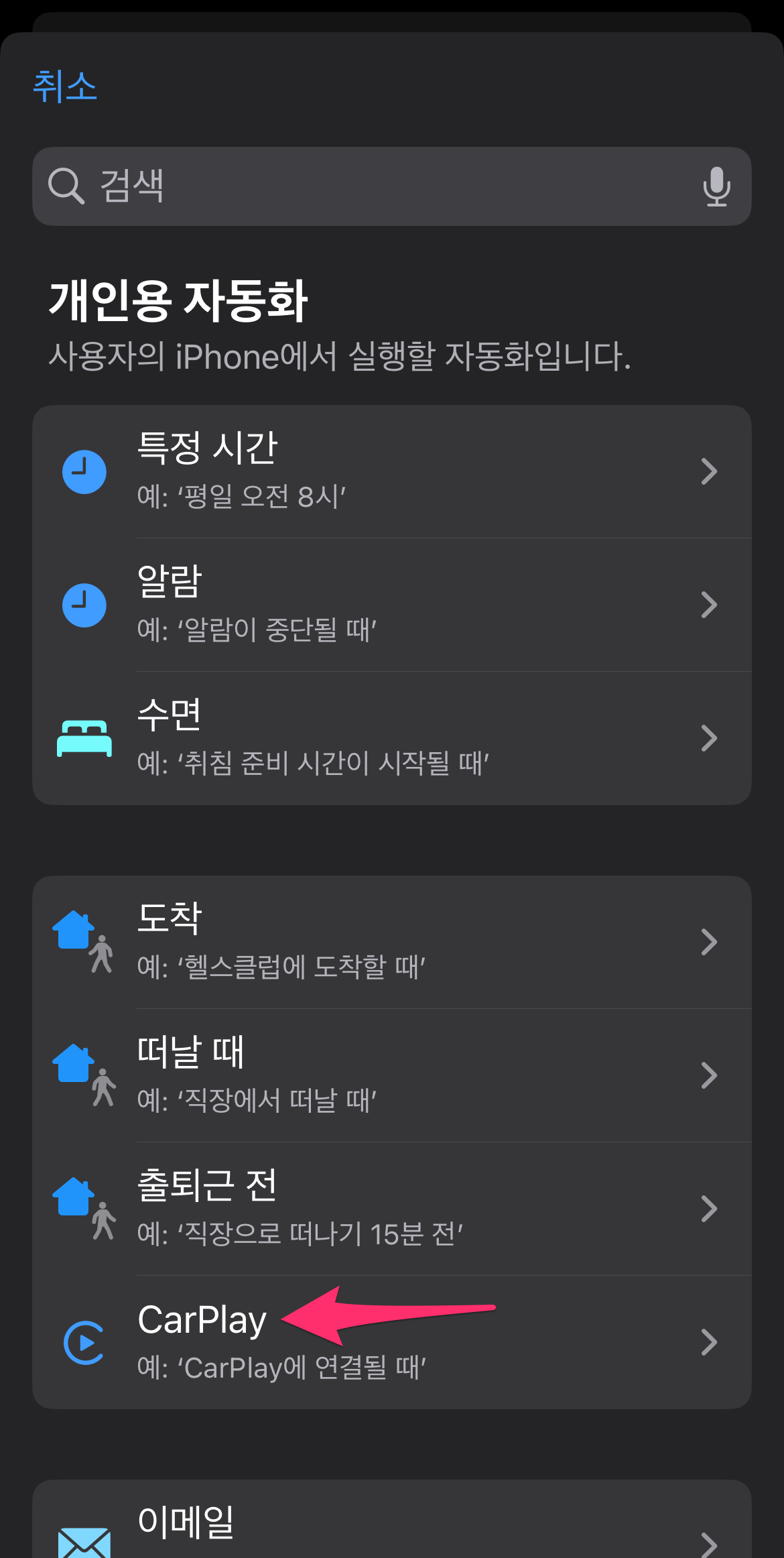 자동화 창에서 오른쪽 상단에 + 버튼을 선택한 후에 자동화 목록에서 CarPlay 를 선택합니다.
