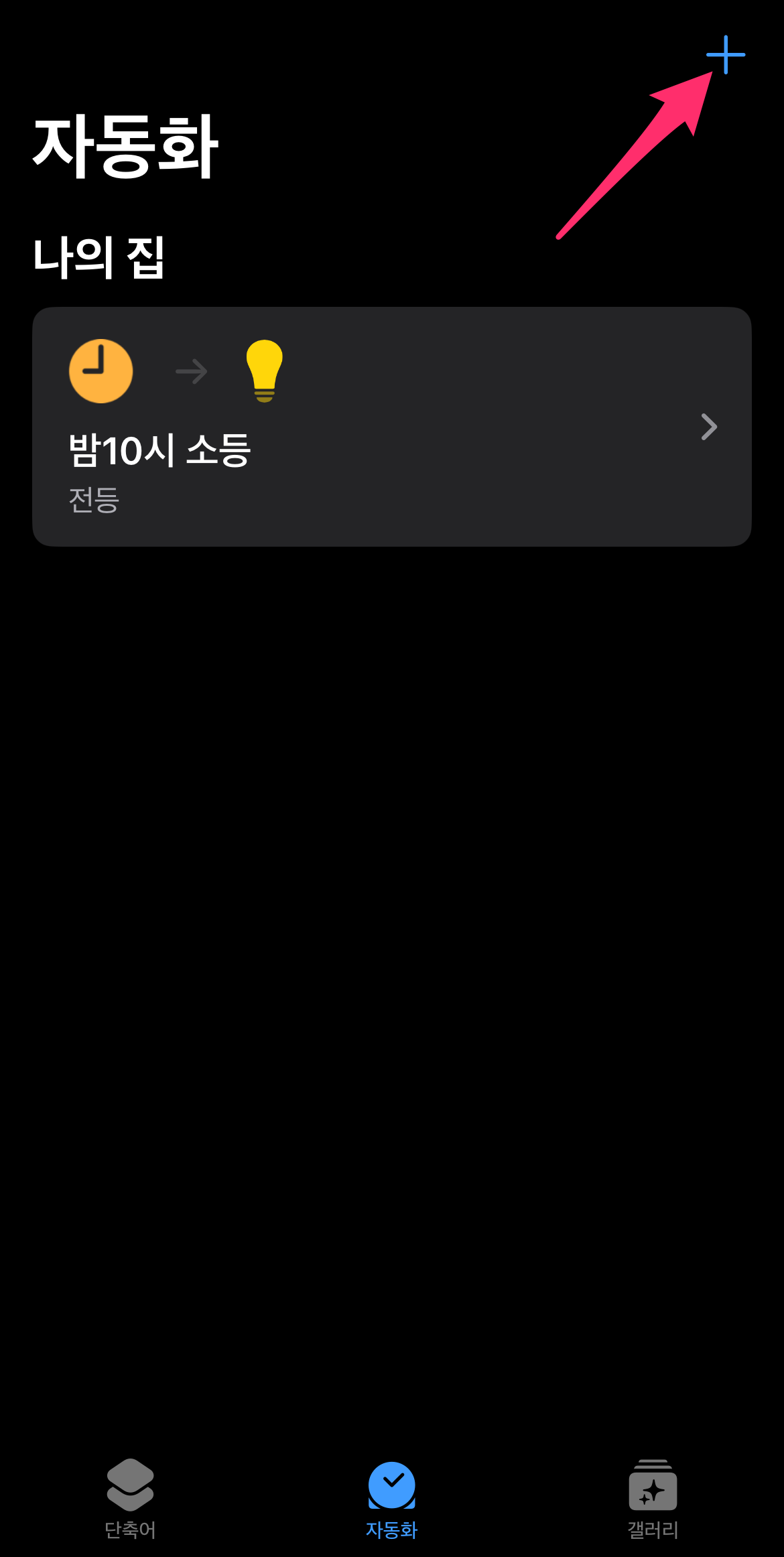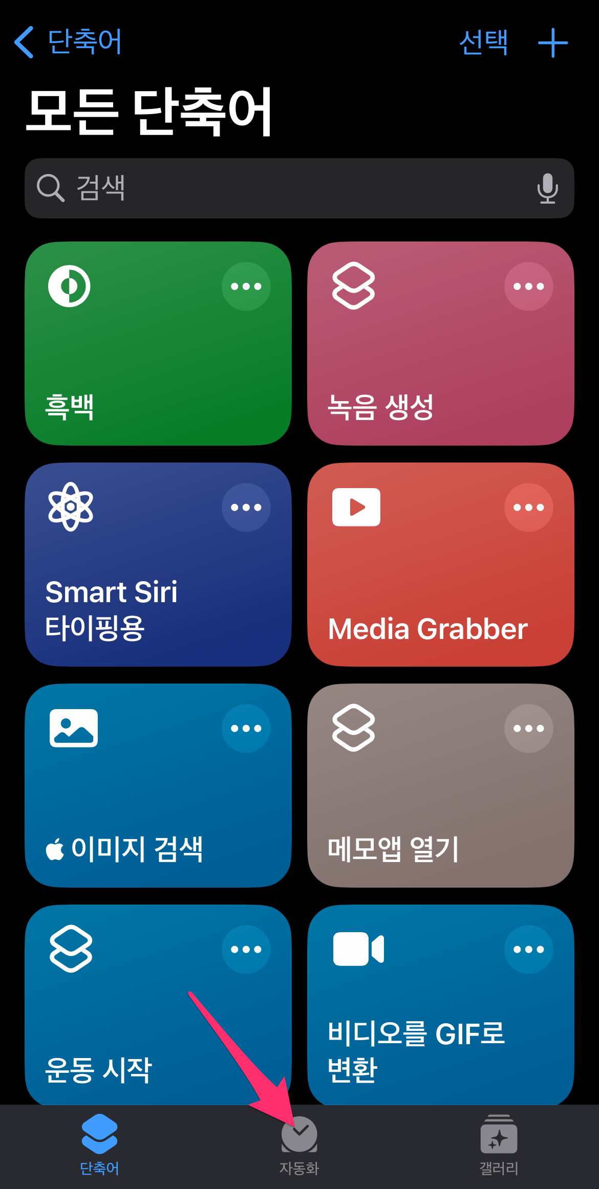 우선 아이폰 단축어앱을 실행한 후에 가운데 하단에 자동화를 선택합니다.