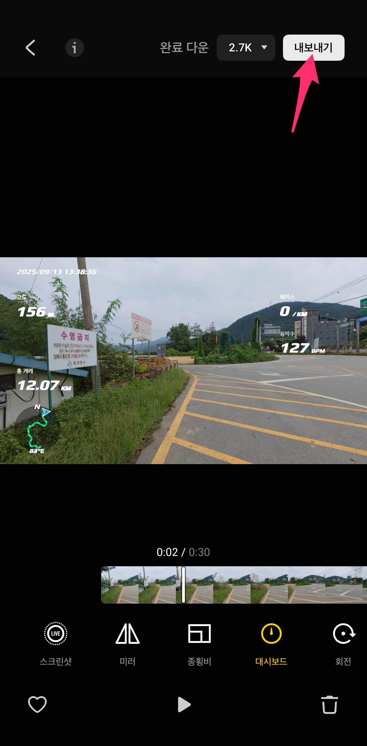 자~ 이제 영상 위에 다양한 데이터가 보입니다. 이제 내보내기 하시면 대시보드가 적용된 영상이 제작됩니다.