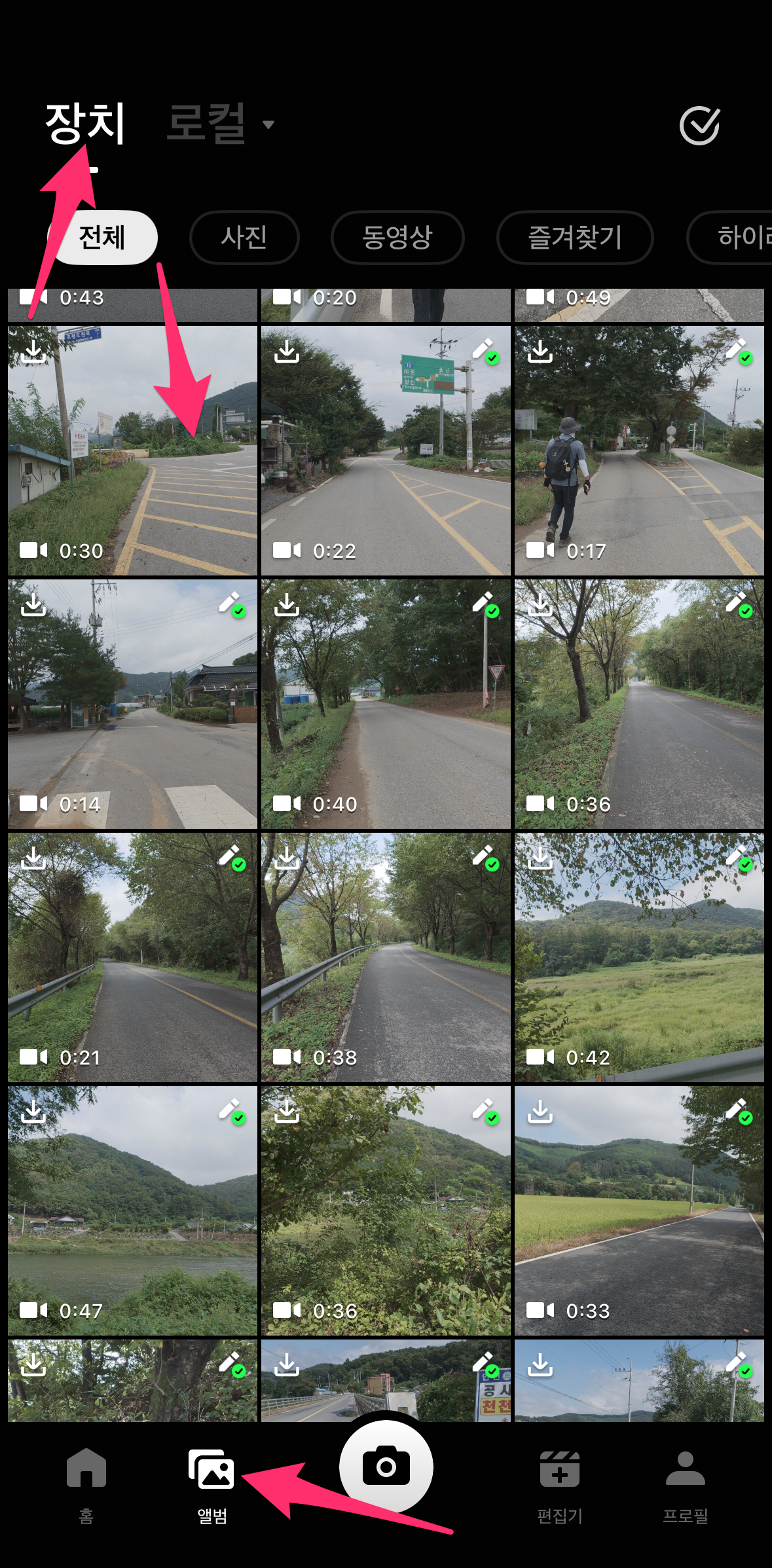 DJI Mimo 앱에서 하단 앨범을 선택하고 장치(액션5 프로)를 선택하면 연결된 장치(액션5 프로) 안의 영상이 보입니다.