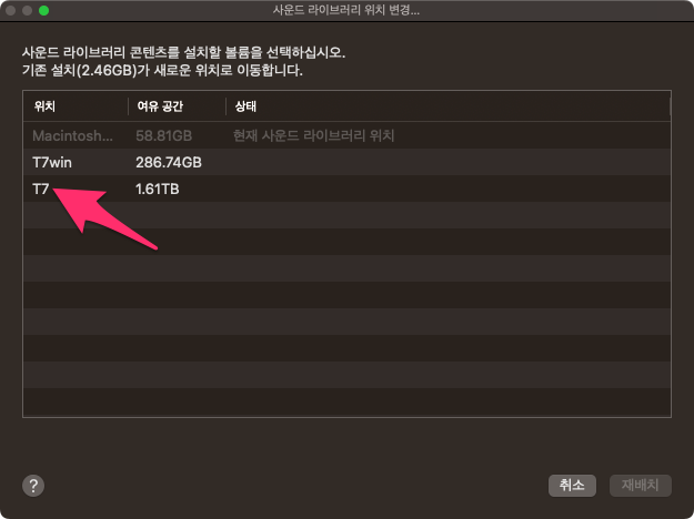 외장하드를 선택한 후에 재배치를 선택하면 자동으로 라이브러리도 외장하드로 설치됩니다.