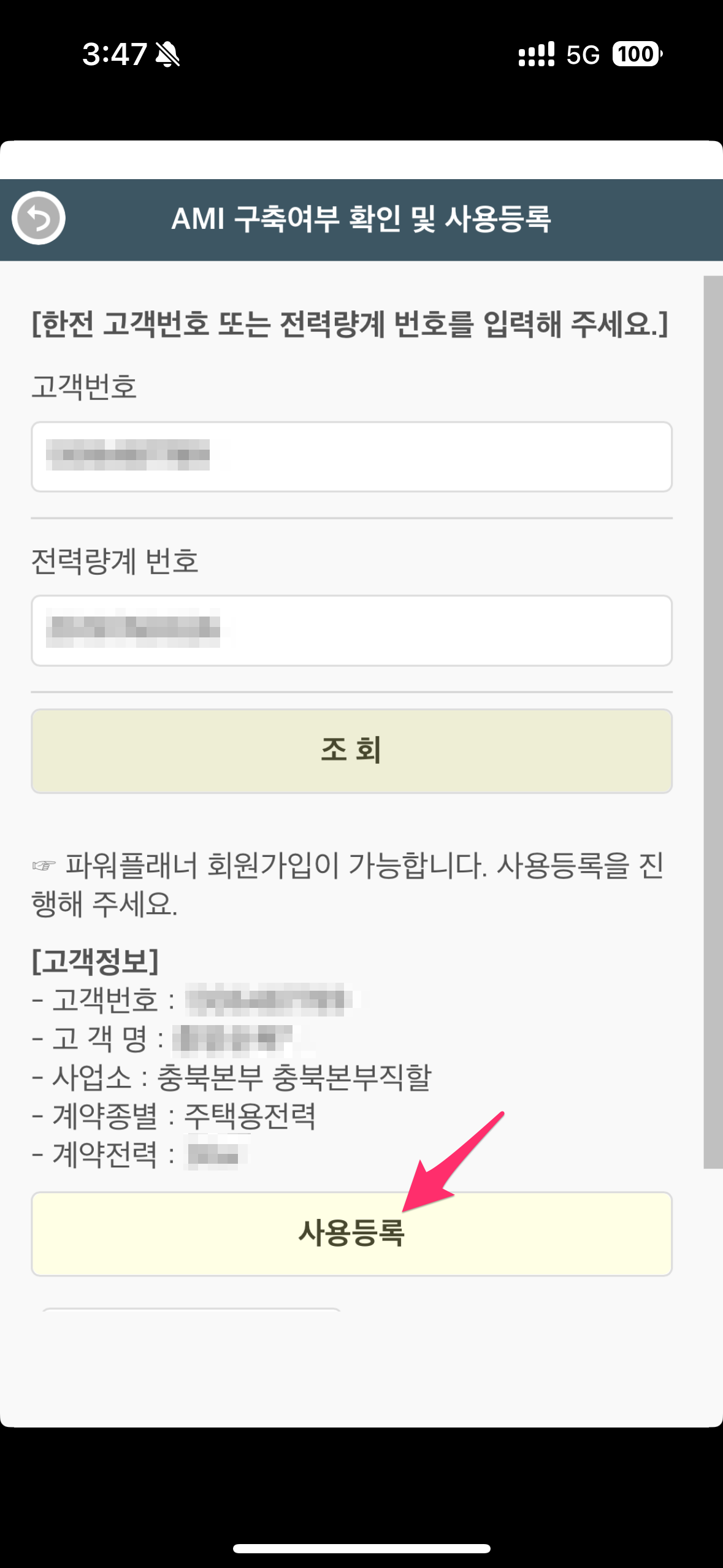 그러면 고객 정보가 나옵니다. 사시는 곳 정보와 비교해서 맞으면 사용등록합니다.