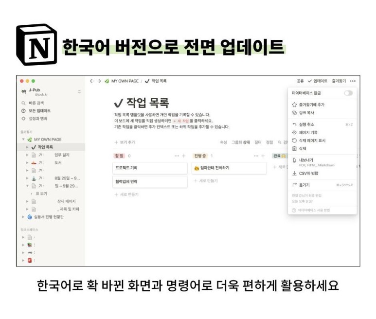 일반적인 데이터베이스 사용법과 여러 데이터베이스를 이용할 수 있는 관계형과 롤업같은 고급 기술도 친절하게 알려주어서 노션 초보자도 상급 사용자가 될 수 있도록 알려주고 있습니다.
