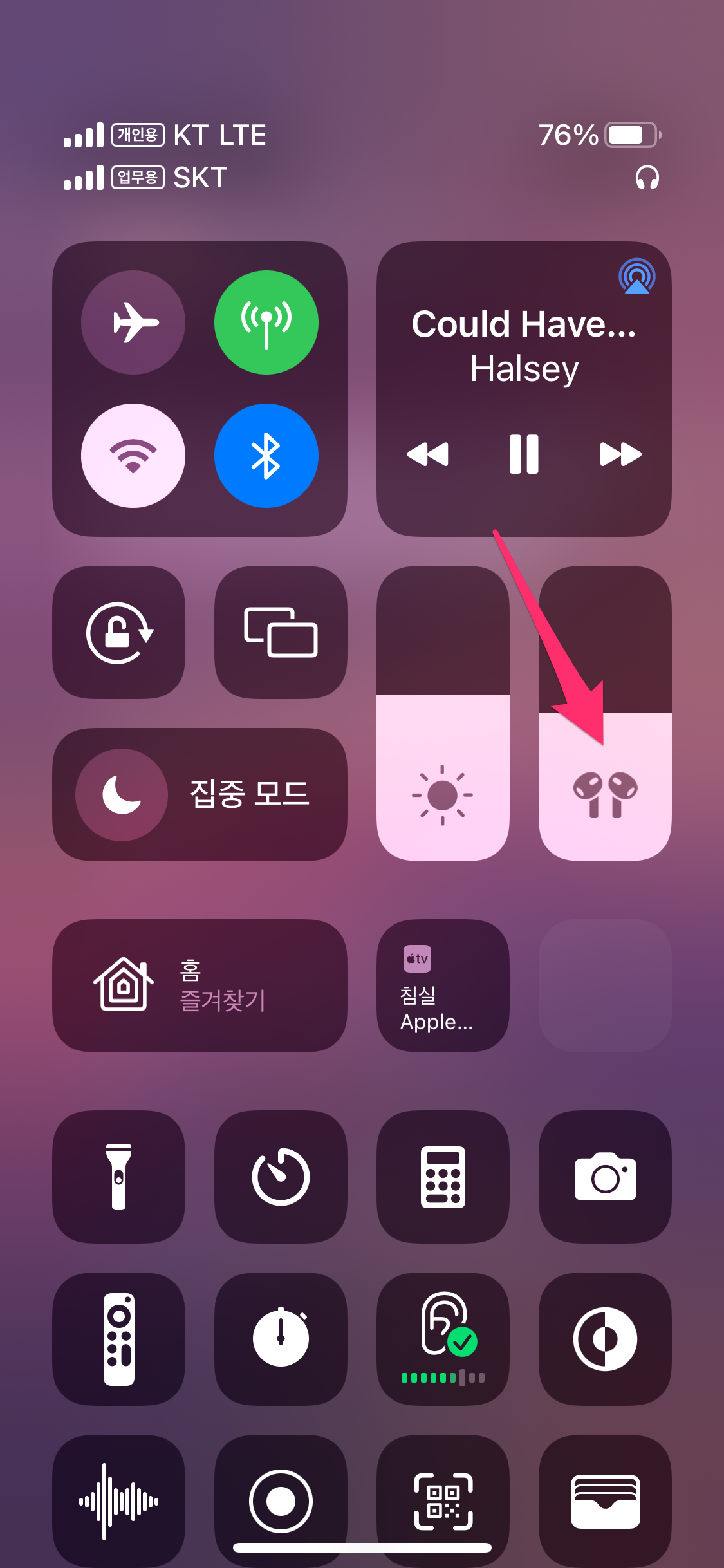 아이폰 화면 상단 오른쪽을 아래로 슬라이딩하면 나오는 제어센터에서 사운드를 힘 있게 누릅니다.