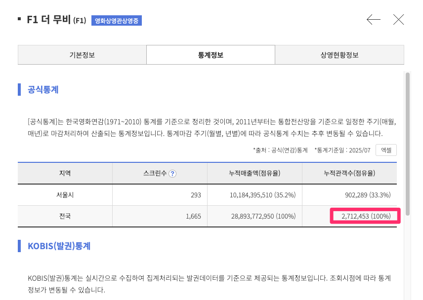 하지만 여기서 놓치면 안 되는 포인트! F1 더 무비도 270만 명이나 봤다는 거예요!