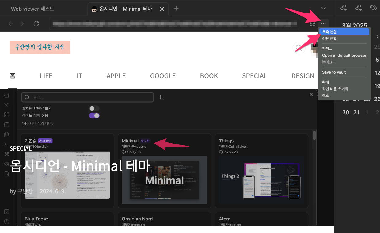 이런 식으로 왼쪽에는 옵시디언 페이지와 오른쪽에는 웹페이지가 보이기에 편리하게 활용할 수 있습니다.