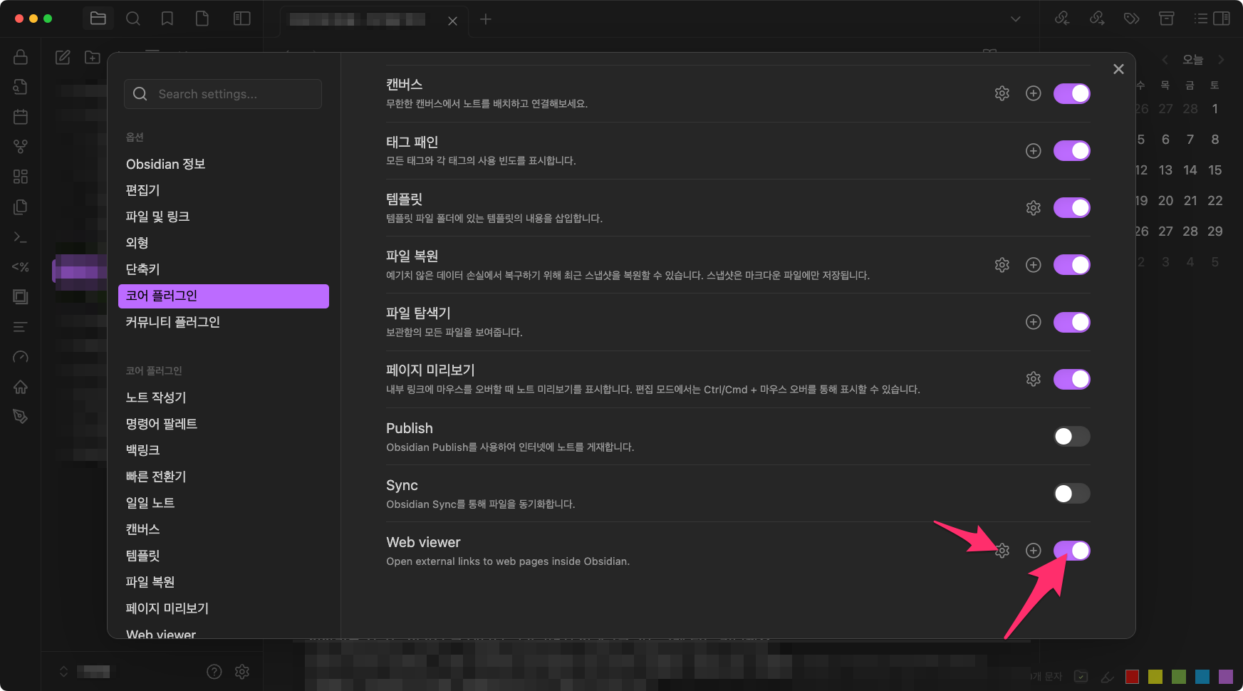 옵시디언에 설정으로 들어가서 코어 플러그인을 선택합니다.