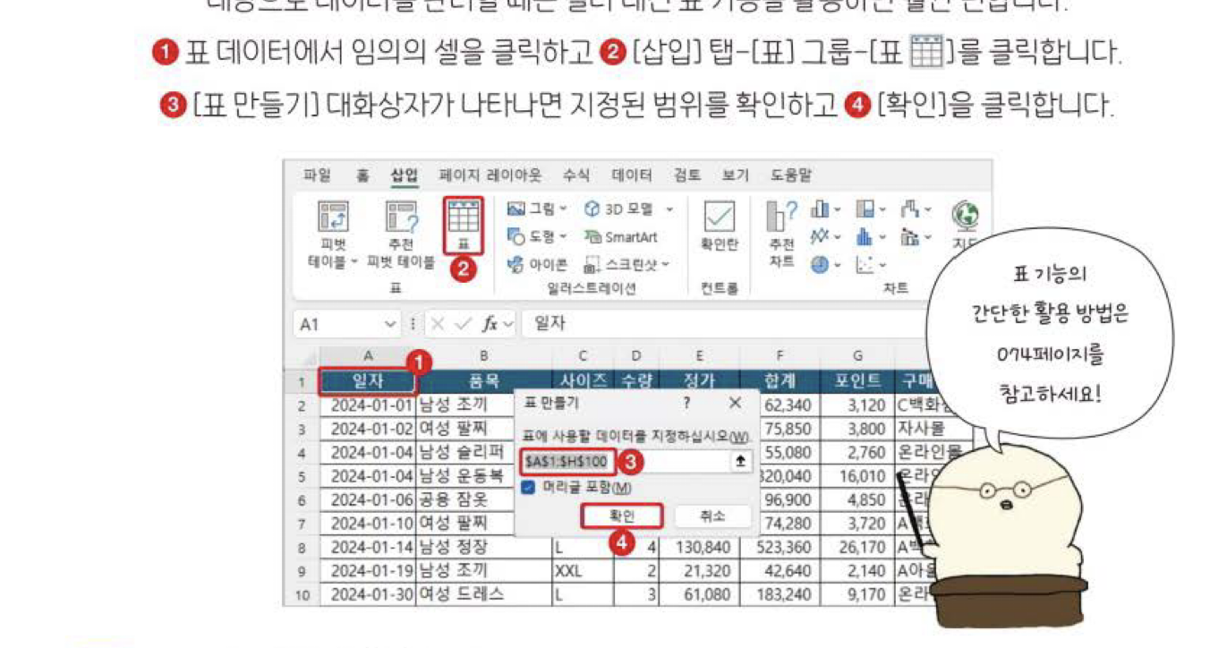 표 만들기, 데이터 정리, 함수 활용 등 실전에서 바로 사용할 수 있는 예제들이 많아서 실용성이 높습니다.