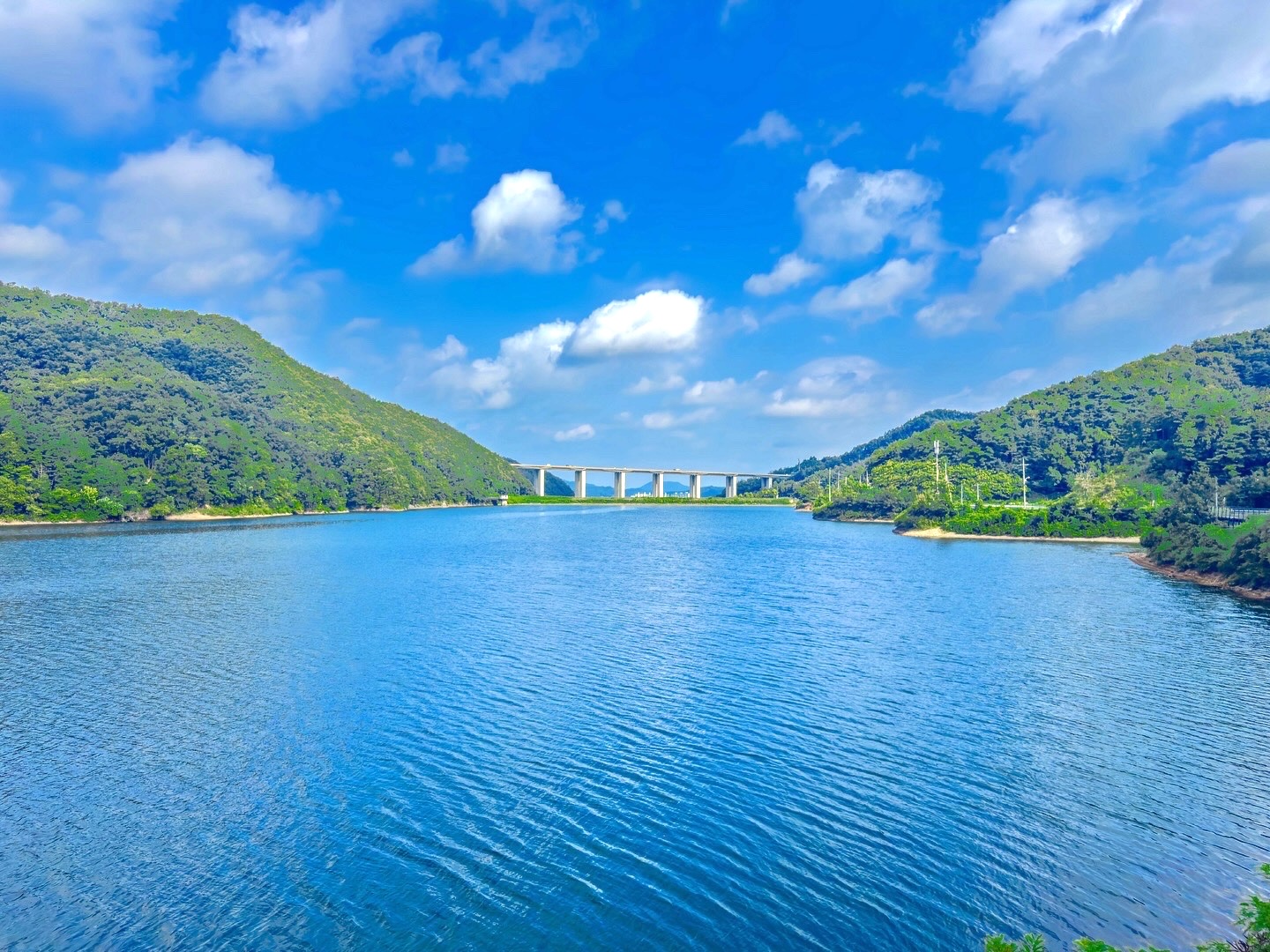 저수지 입구에서 바라본 첫 번째 풍경이에요. 맑고 푸른 하늘에 뭉게구름이 둥둥 떠있고, 그 아래로 펼쳐진 용계저수지의 잔잔한 물결이 정말 인상적이었어요.