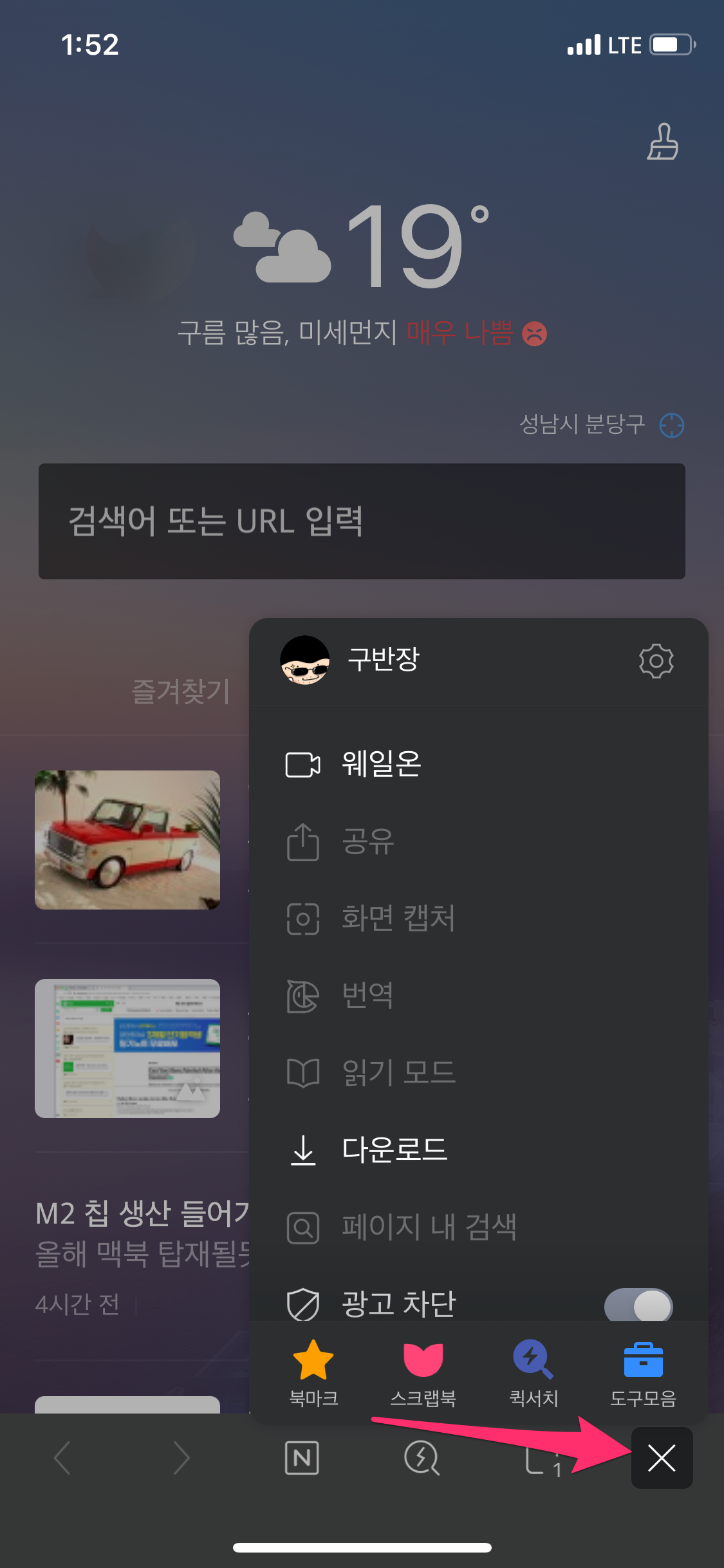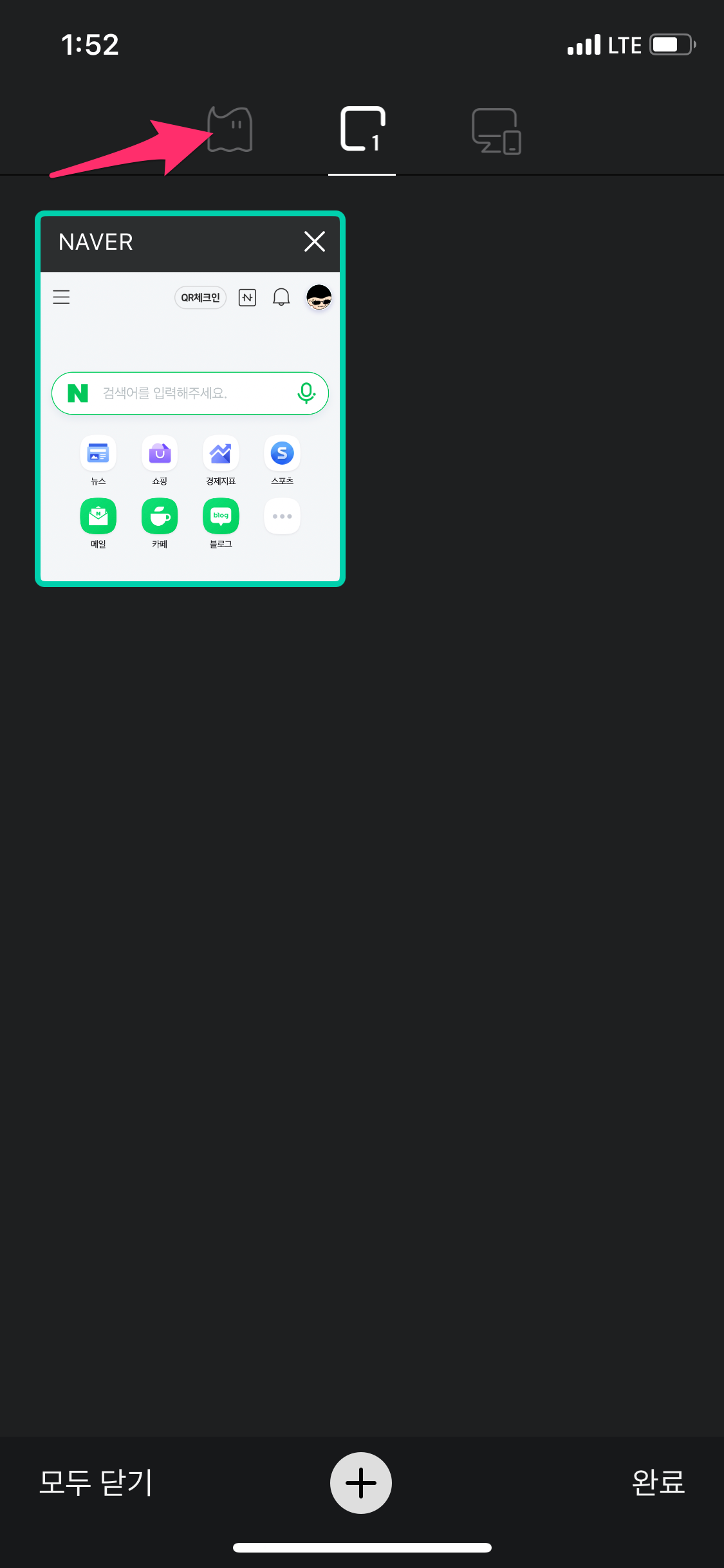 하단에 탭 버튼을 누르면 열린 탭들과 함께 상단 왼쪽에 있는 시크릿 버튼을 선택하면 시크릿 모드로 전환됩니다.