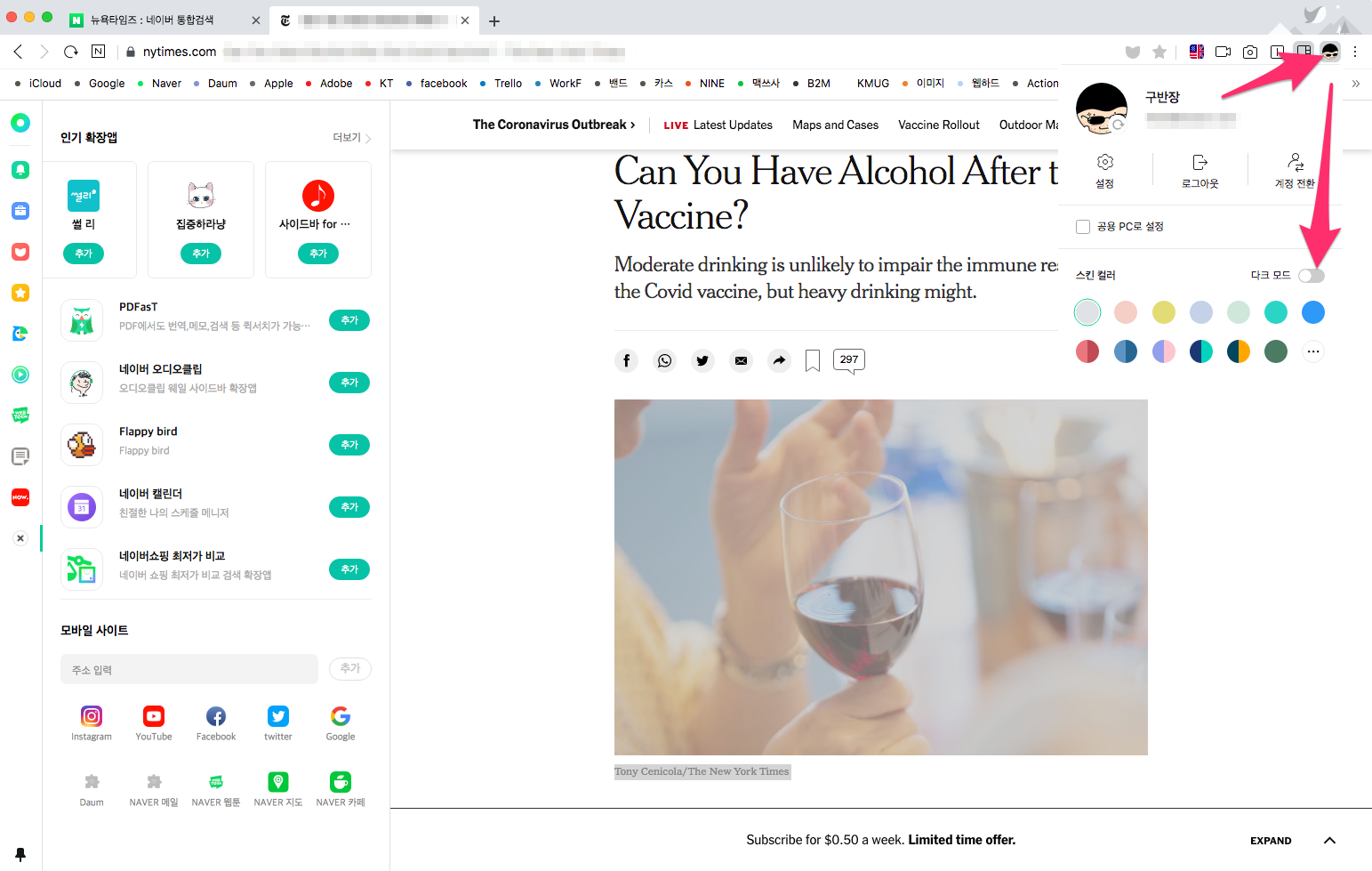 계정 아이콘을 선택하고 하단에 다크 모드를 선택합니다.