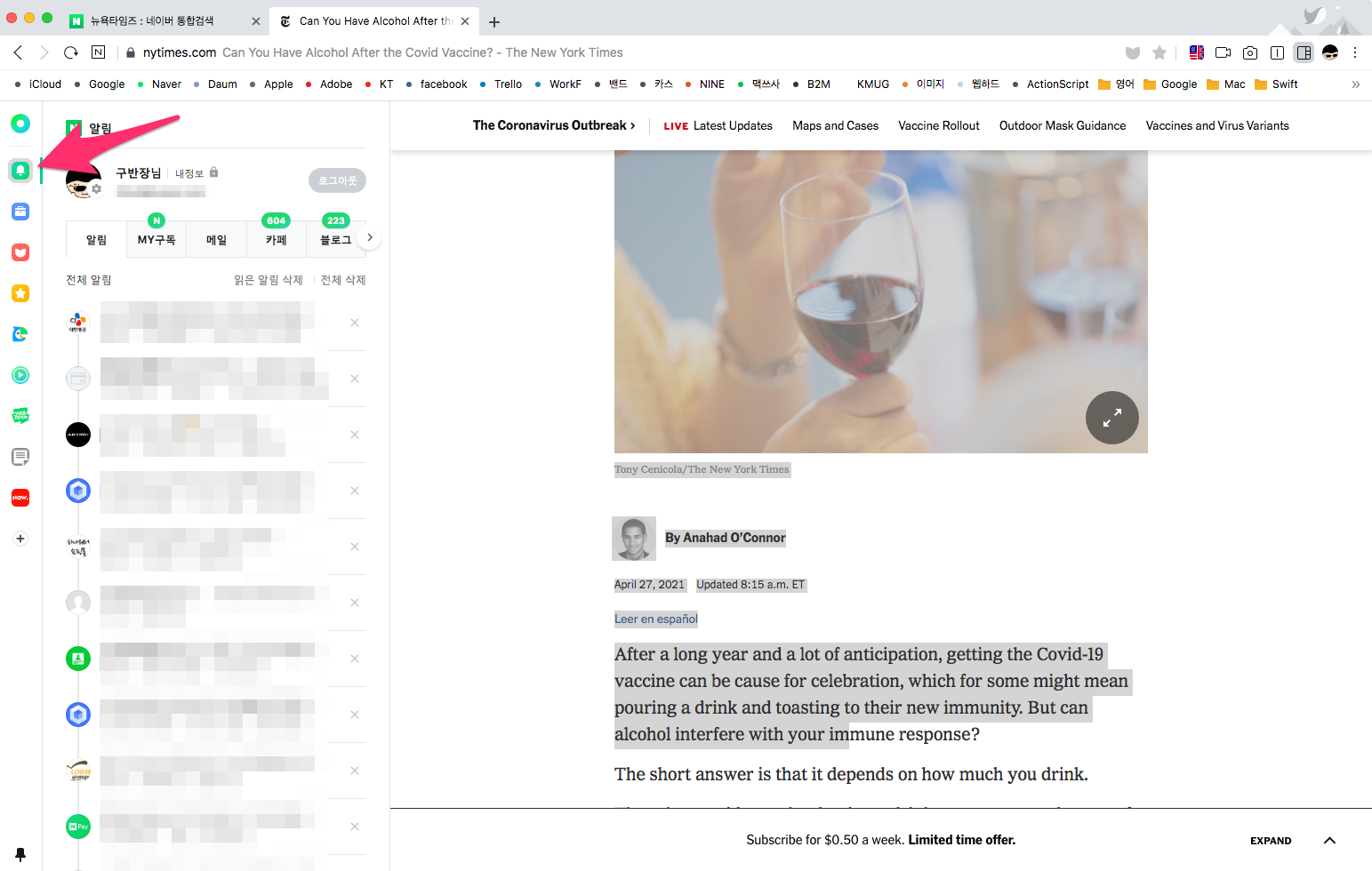 네이버 알림으로 다양한 알림(MY 구독, 메일, 카페, 블로그 등)을 확인할 수 있습니다.