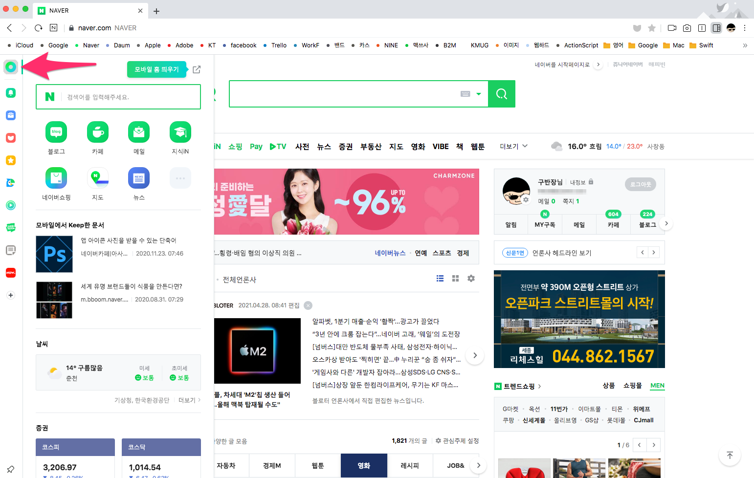 인기 확장앱을 비롯하여 모바일 사이트도 사이드바에 추가할 수 있습니다.