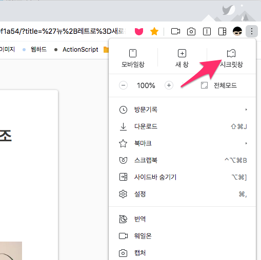 또한 스크릿창을 선택하여 시크릿 모드로 전환하면 방문 기록, 쿠키, 검색 기록이 남지 않습니다.