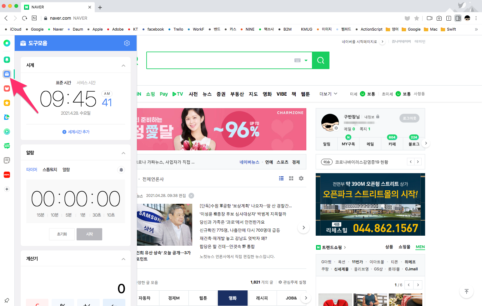 사이드바에 있는 뮤직 플레이어와 네이버 웹툰을 선택하면 뮤직과 웹툰을 감상할 수 있습니다.
