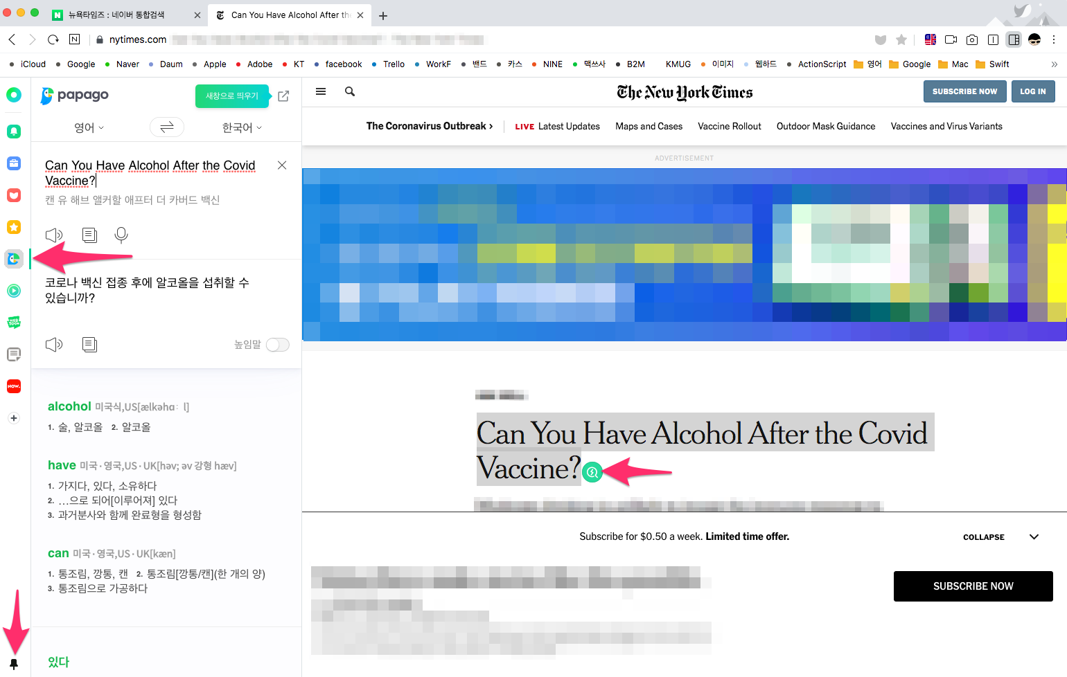 녹색 돋보기를 선택하고 번역을 선택하면 번역이 되고 더 보기를 누르면 사이드바에 있는 파파고 창이 나오면서 자세한 번역 내용을 볼 수 있습니다.