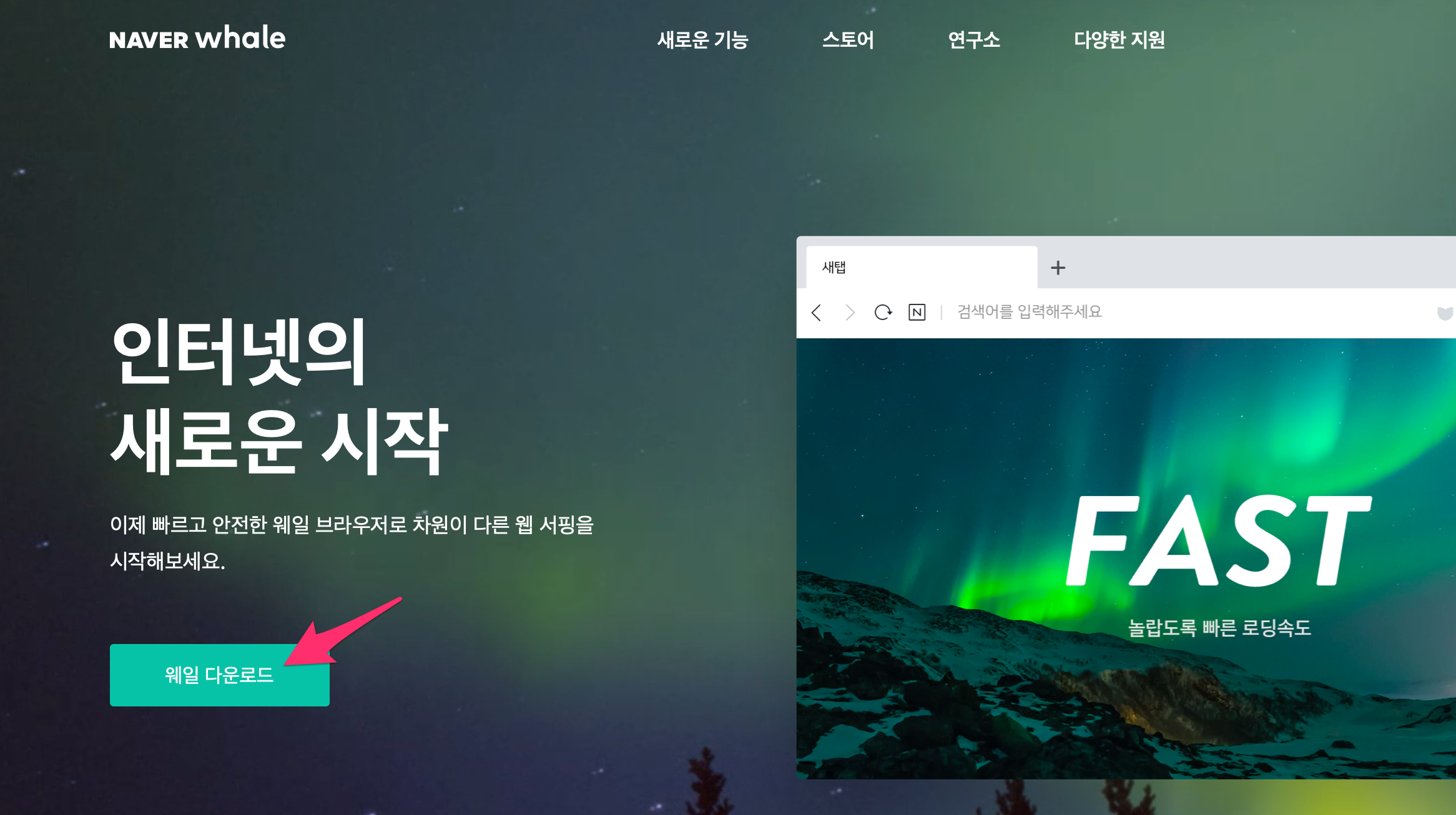 네이버에서 웨일을 검색하시면 소개 페이지가 나옵니다.