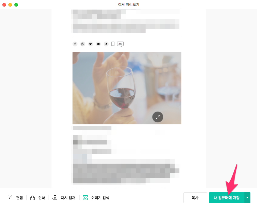 캡처(카메라 아이콘)을 선택하여 원하는 부분을 이미지로 캡처합니다.
