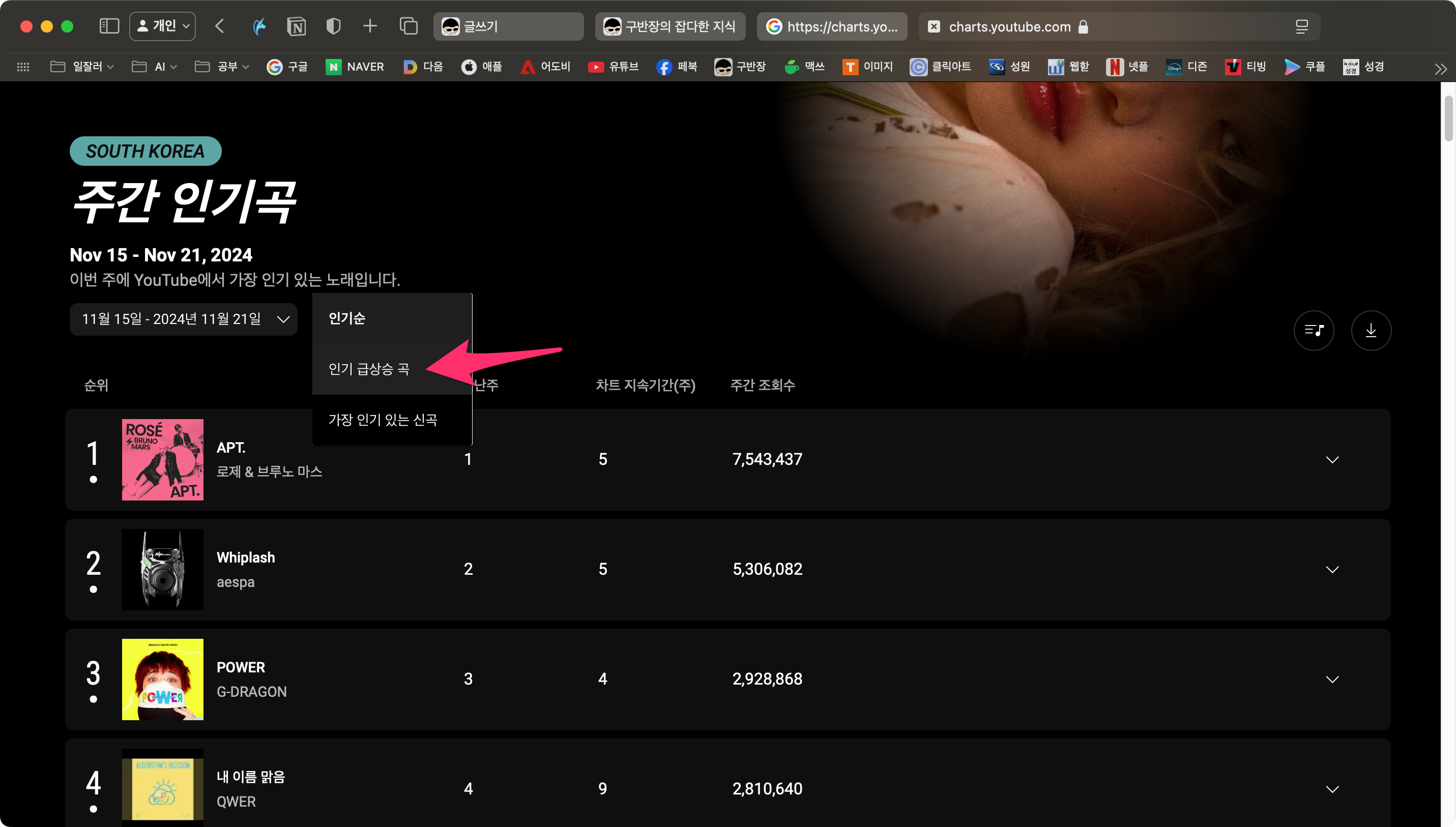 3가지 차트(인기순, 인기 급상승 곡, 가장 인기 있는 신곡) 중에 원하시는 차트를 선택하시면 됩니다.