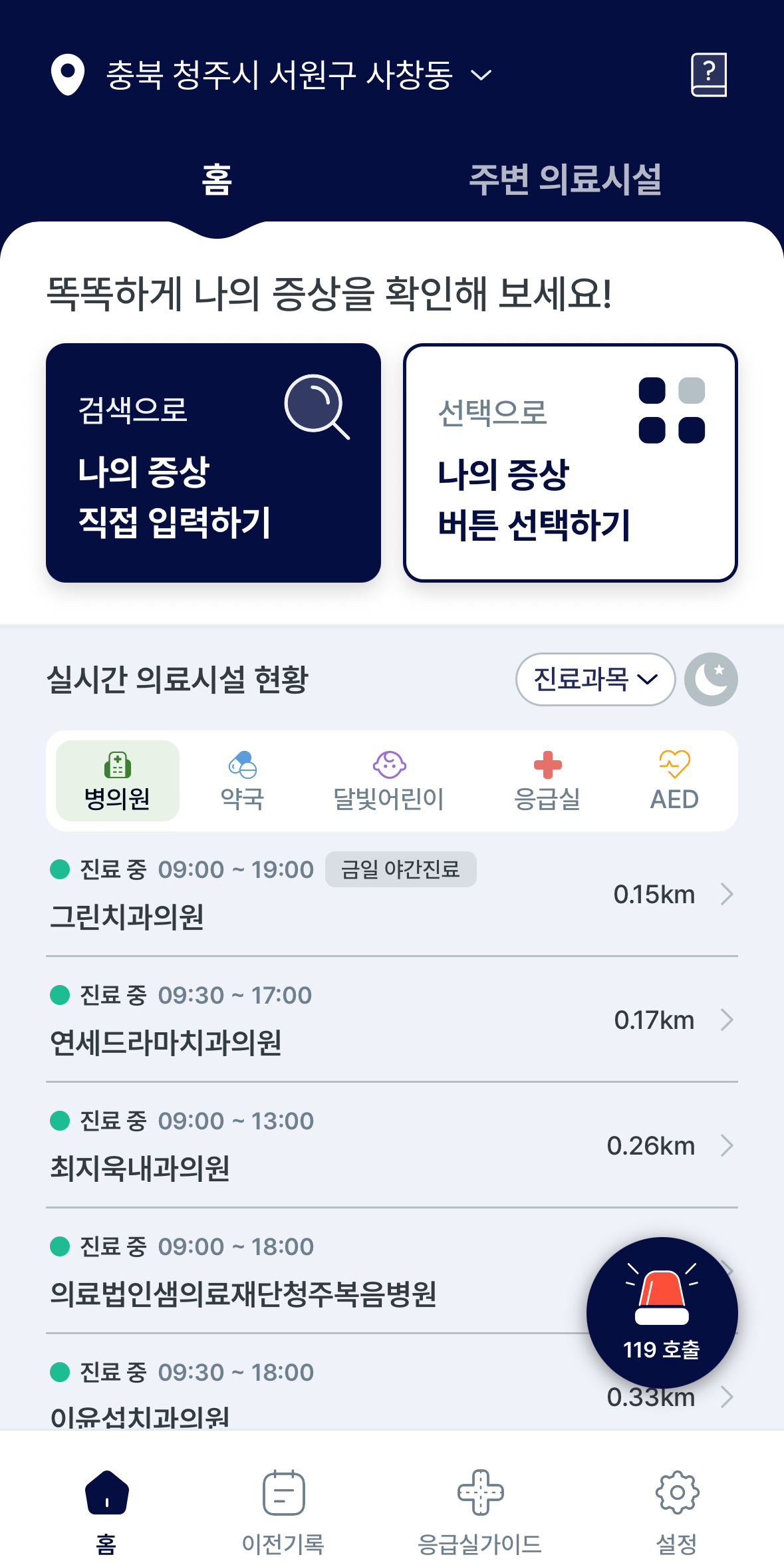 발열, 두통, 복통 등 현재 증상을 입력하면 적절한 의료기관을 추천하고, 응급처치 방법을 안내하며, 심각한 증상이면 앱에서 직접 119를 호출할 수 있습니다. 응급실에 가야 할지 일반 병의원이면 될지 판단하는 데 도움을 줍니다.
