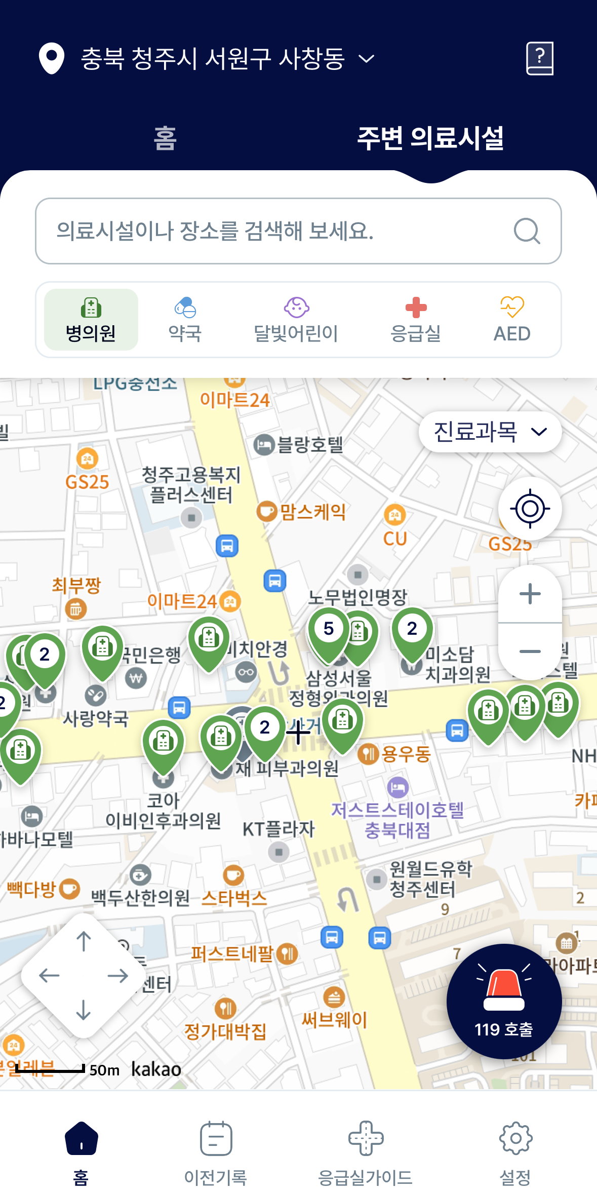사전에 앱스토어나 구글플레이에서 응급의료정보제공을 검색하여 설치해 두세요.