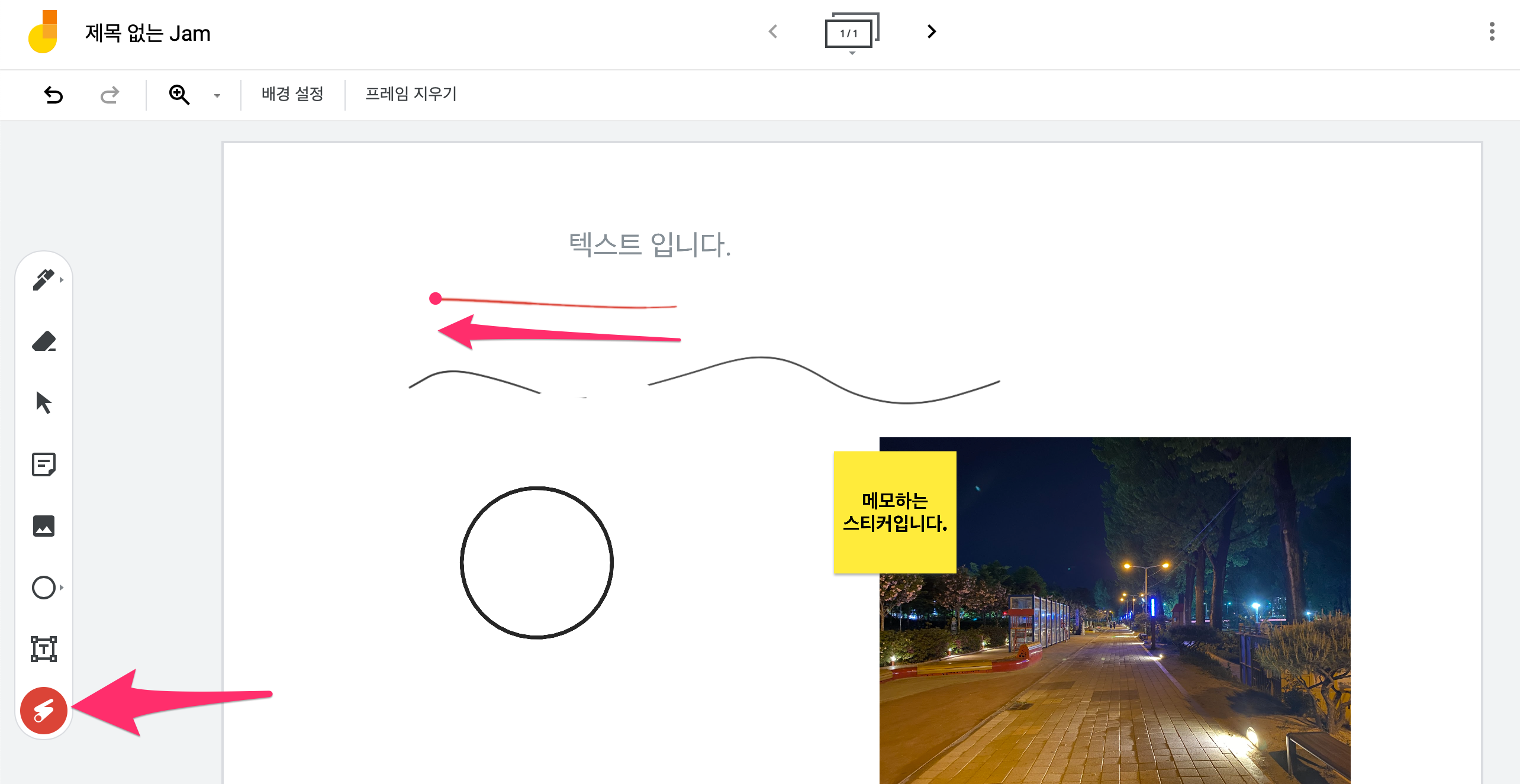 그중에서 맨 위에 있는 펜 도구를 선택하고 보드에 선 긋기를 해보시길 바랍니다.