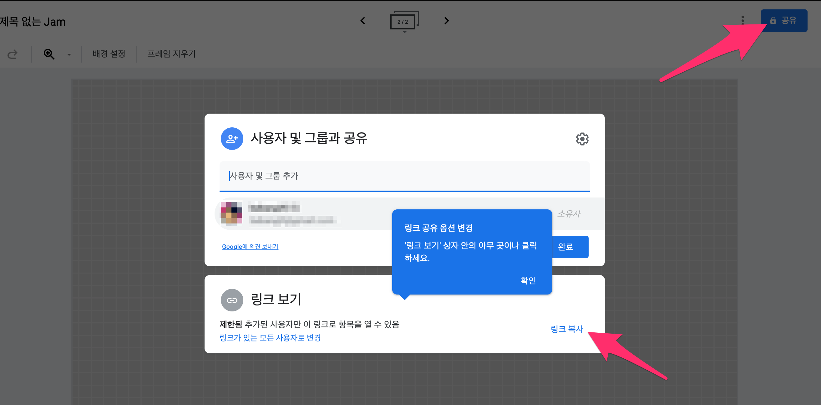 그리고 하단 링크 보기를 보시면 링크가 있는 모든 사용자로 변경으로 설정된 것을 확인하고 링크 복사를 선택하고 복사된 링크를 사람들에게 보내시면 링크로 접속한 사람들은 잼보드를 보기 전용으로 실시간 관찰이 됩니다.