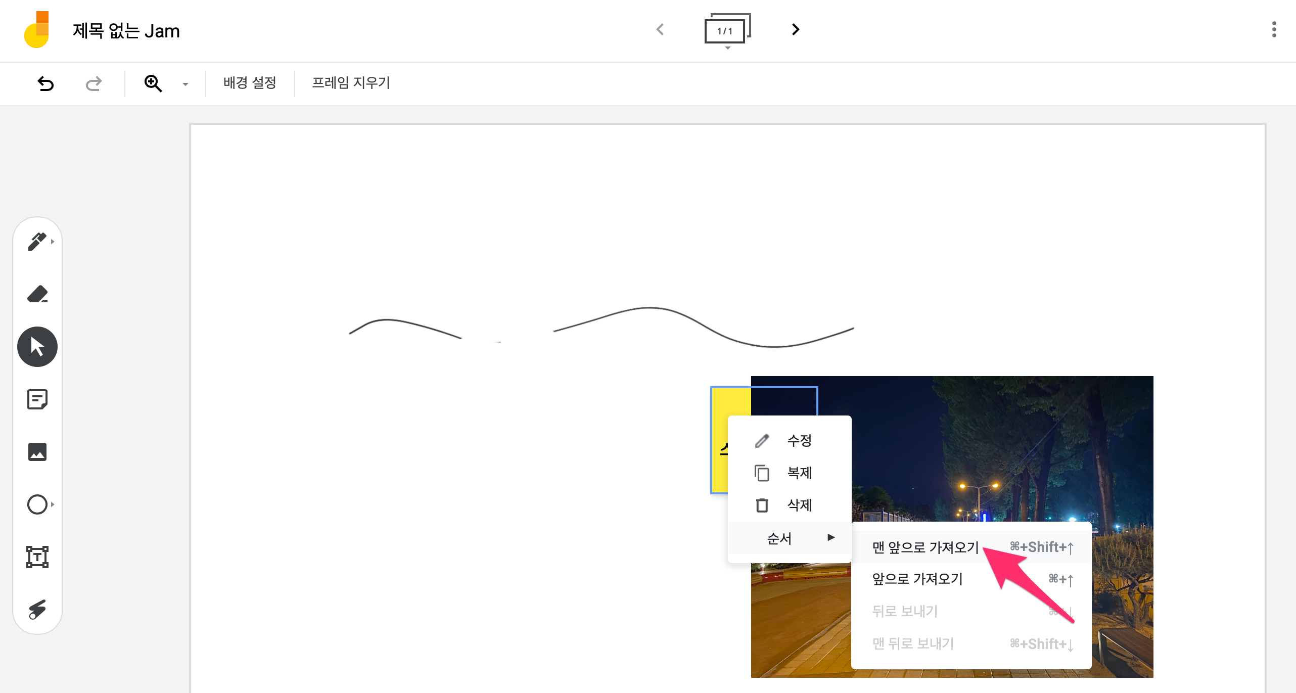 순서를 선택한 후에 맨 앞으로 가져오기를 선택하면 스티커 메모가 이미지 앞으로 나옵니다.