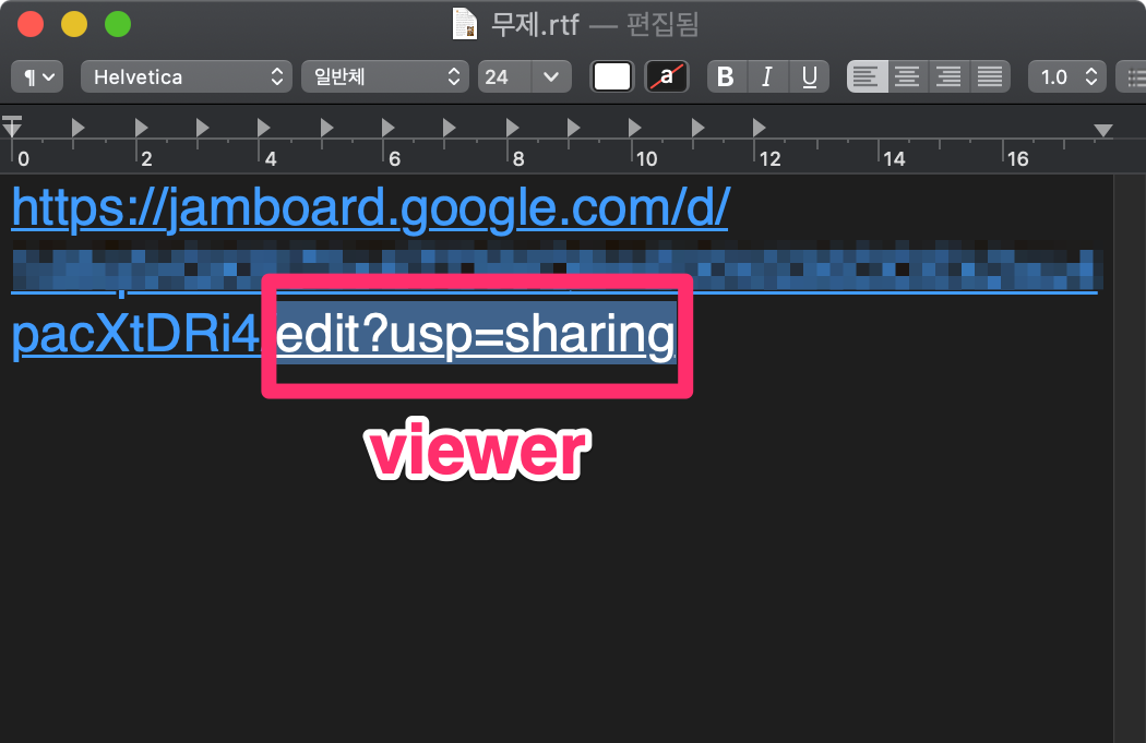 그래서 복사한 링크에 마지막 부분인 /edit?usp=sharing 이후를 삭제하고 /viewer 로 변경하신 후에 링크를 보내줍니다.