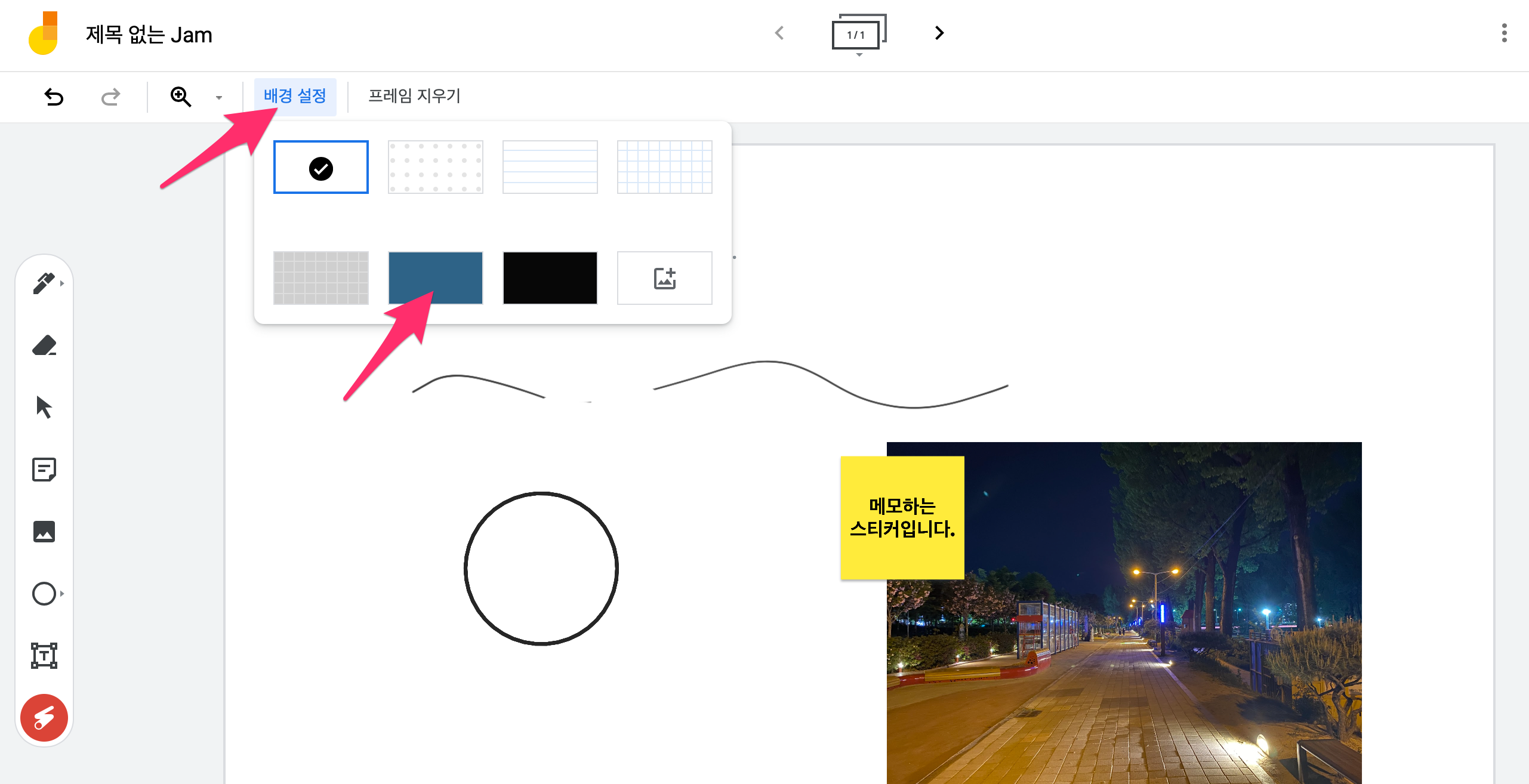 상단에 배경 설정을 선택하고 원하는 배경을 선택하면 배경이 변경됩니다.