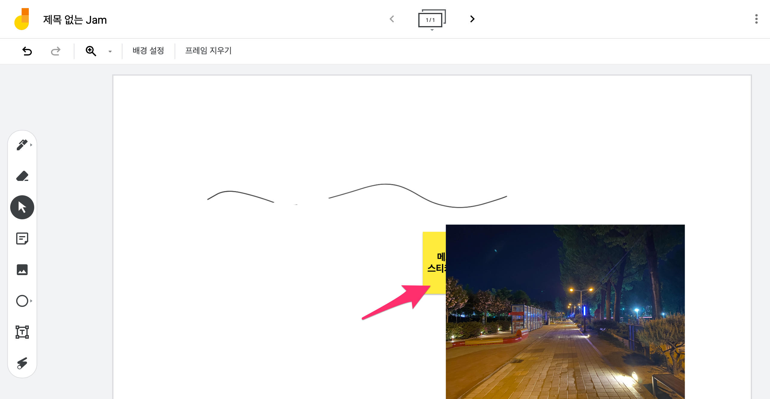 보드에 이미지가 놓여집니다. 그런데 아까 만든 스티커 메모가 이미지 뒤에 가려져서 안 보입니다.