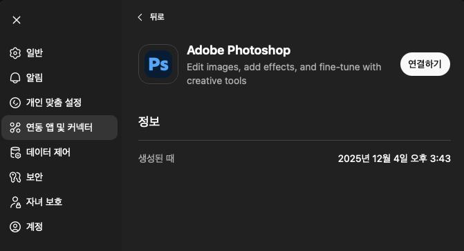 챗GPT에 로그인한 후 [설정] → [연동 앱 및 커넥터] → 하단 [Browse Apps]에서 어도비 앱을 활성화하면 되는데요.
