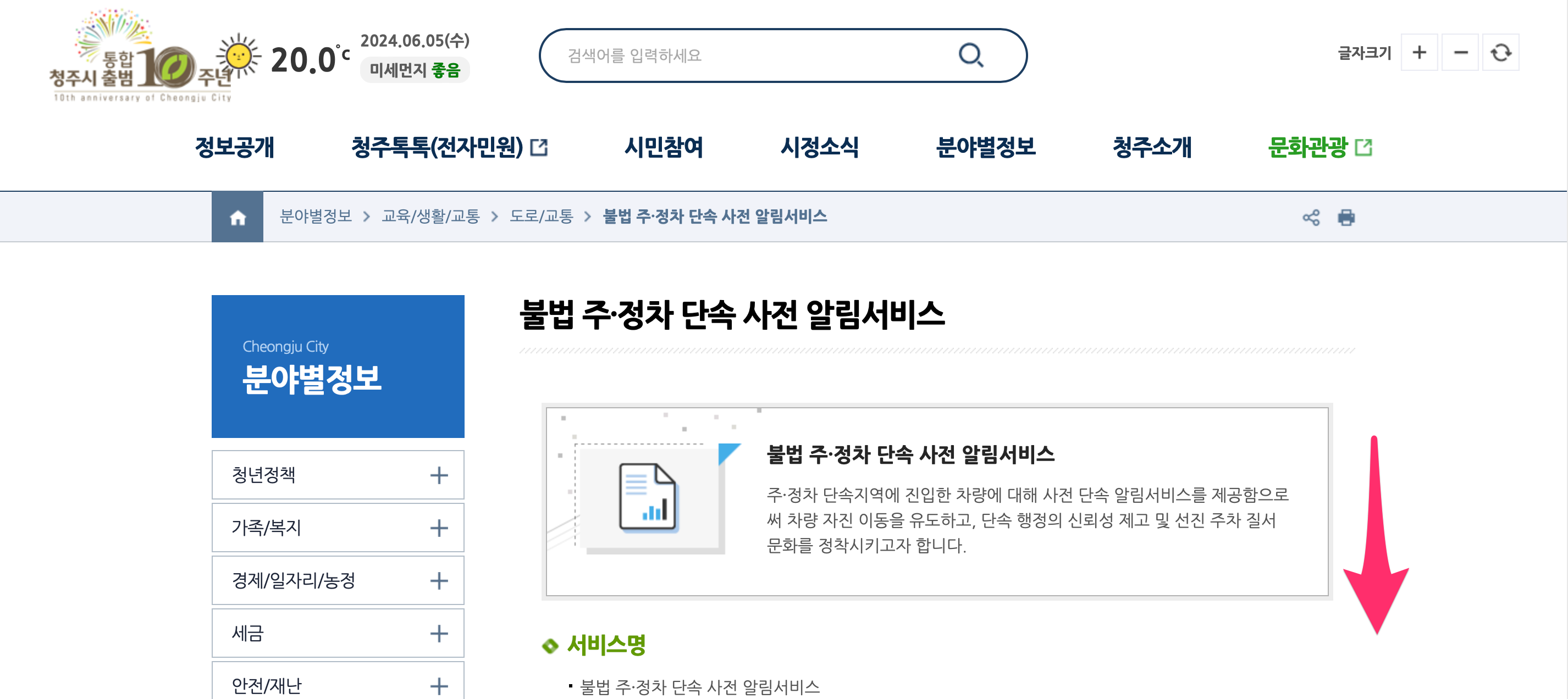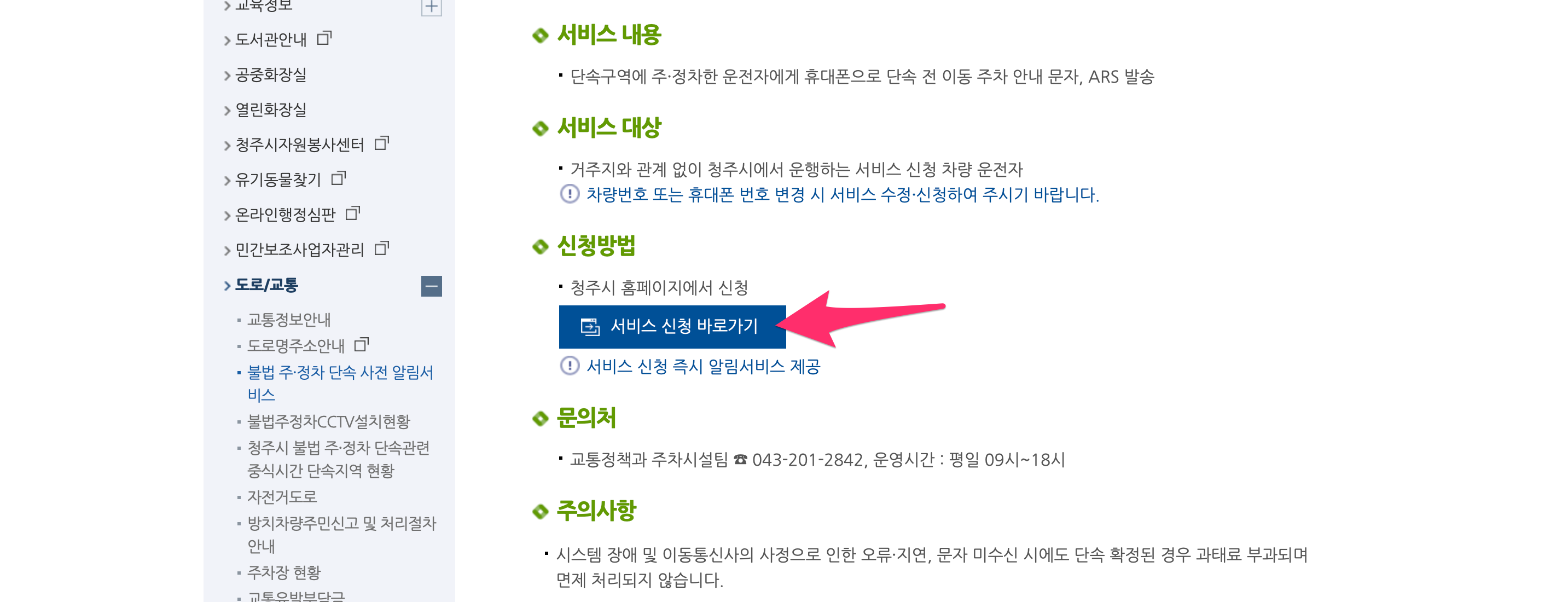 상단 메뉴 [분야별정보] - [교육/생활/교통] - [도로/교통] - [불법 주정차 단속 사전 알림서비스]로 찾아가시면 됩니다.