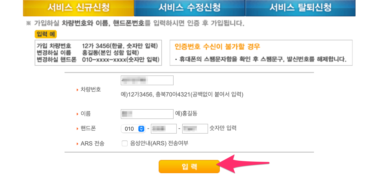 가입하실 차량번호, 이름, 핸드폰 번호를 기입합니다.