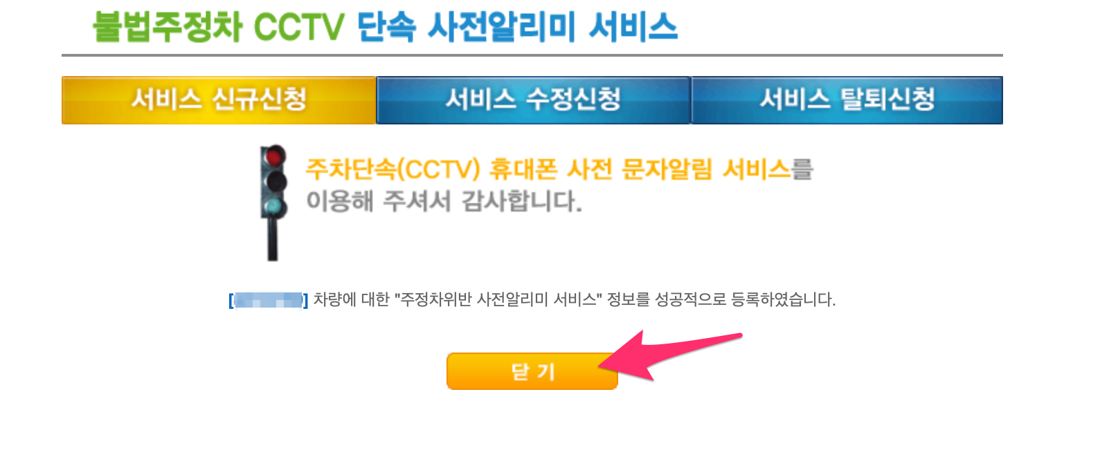 이제 주정차위반 사전알림 서비스를 성공적으로 등록되었다고 메시지가 나오면 닫기 버튼을 클릭하여 마무리합니다.