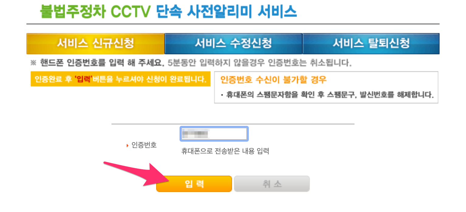 입력한 핸드폰 번호로 인증번호가 오면 입력창에 입력 후 입력 버튼을 클릭합니다.