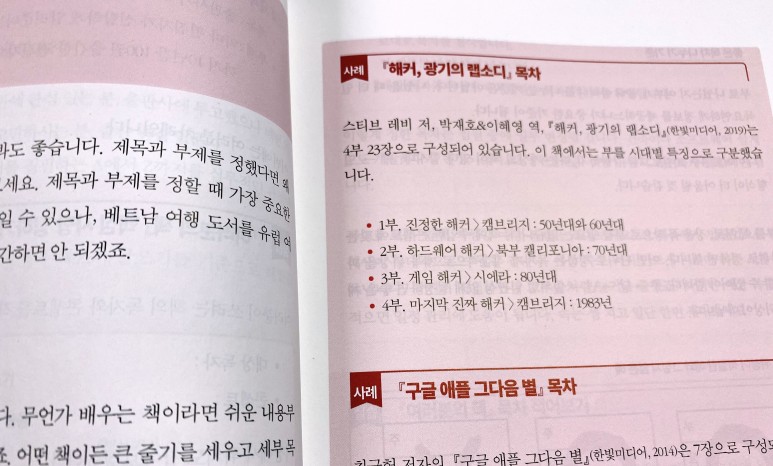 예전에 저처럼 무식(?)하게 덤비는 것이 아니라 분석하고 어떻게 하면 독자들이 읽을 수 있는 책쓰기를 조언해 주고 있다. 또한 출판된 다른 책들의 사례를 보여주어서 어떤 식으로 책쓰기를 접근할지도 알려주고 있다.