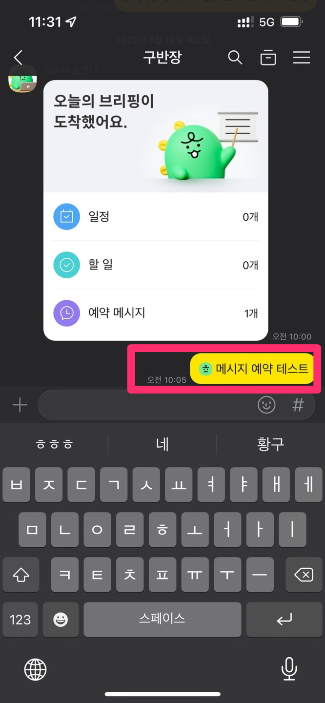 특이하게 메시지 왼쪽에 조르디 아이콘이 보이네요^^ 아마 예약 메시지라는 것을 알려주는 표시 같습니다.