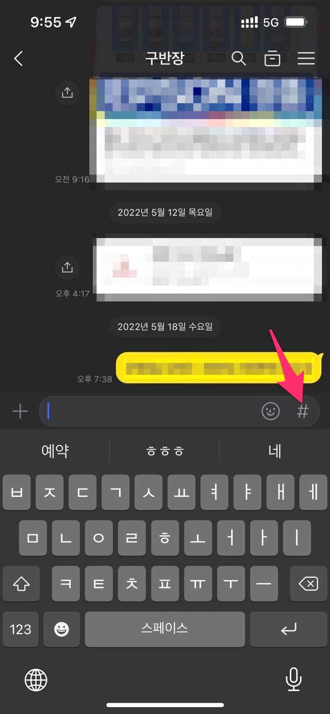 업데이트를 마친 후에 원하는 상대방 카톡 참을 여신 후에 메시지 창 옆에 있는 # 버튼을 선택합니다.
