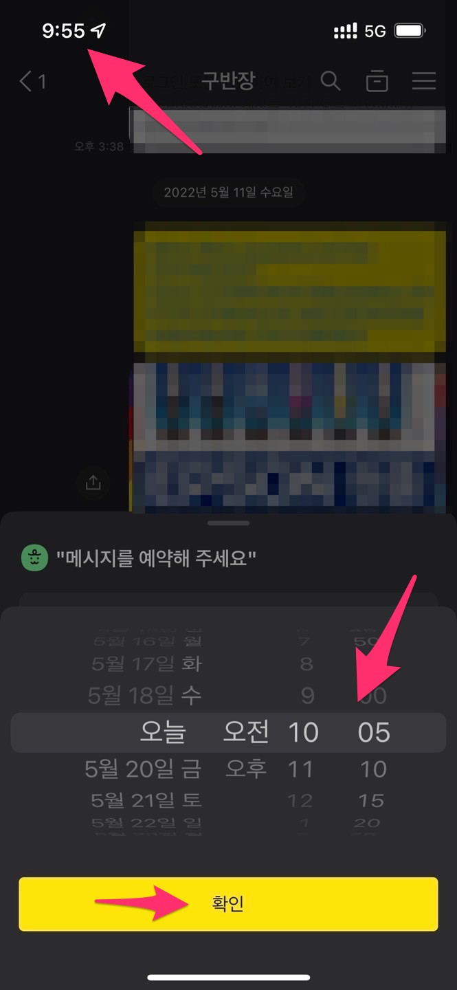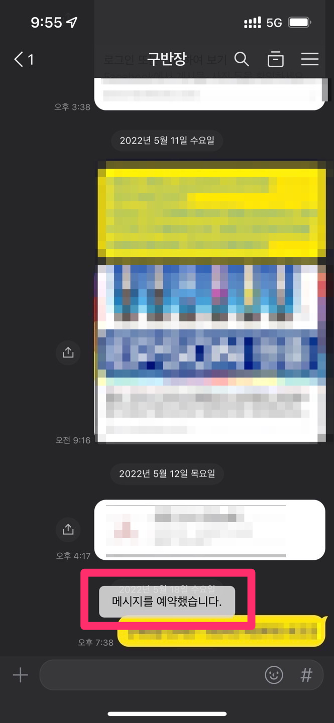 예를 들어 오전 9시 55분에 예약 메시지를 쓴다면 최소 10시 05분 이후로 메시지 발송이 가능합니다.