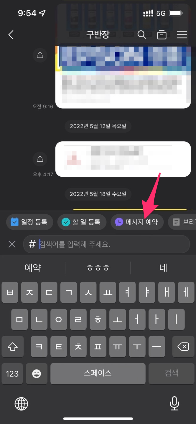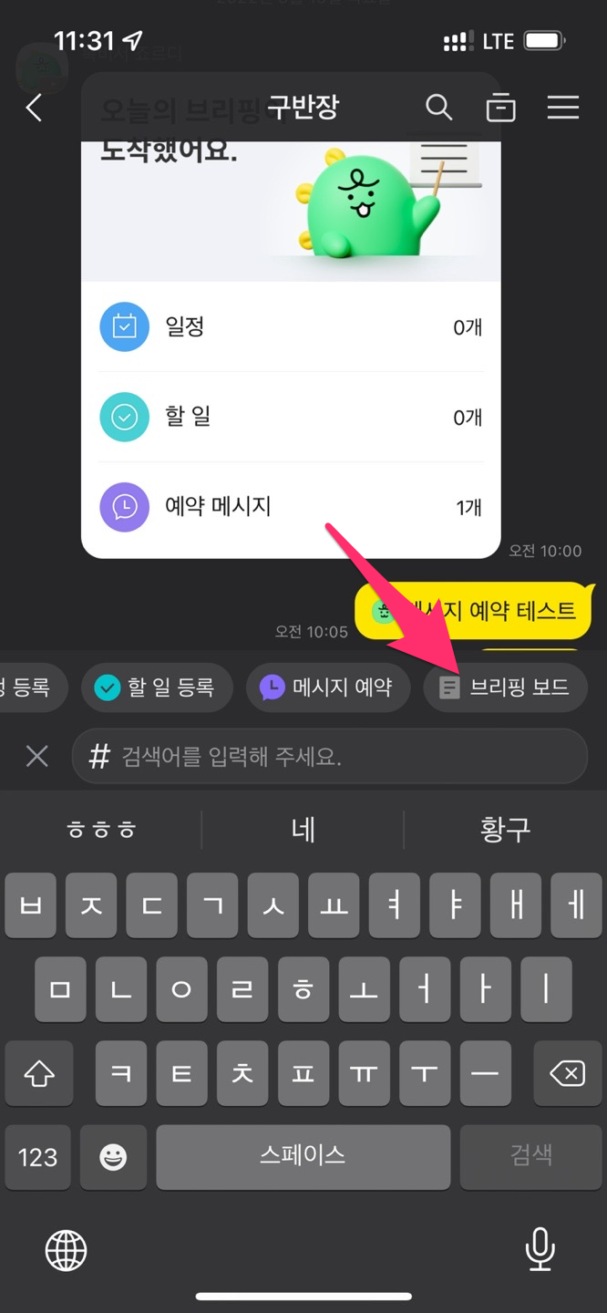 혹시나 예약 메시지를 여러 명에게 다양한 예약 메시지를 보내고 확인하고 싶으시면 메시지 창에 #를 누르시고 브리핑 보드를 선택합니다.