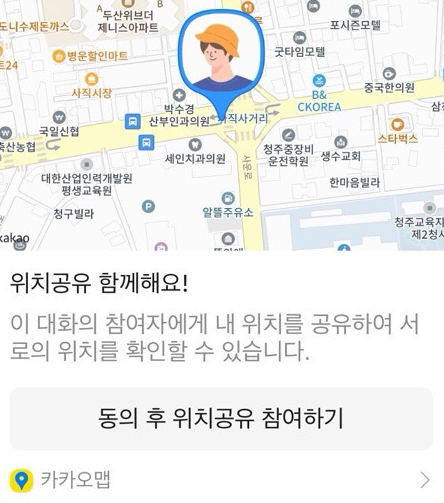 그러면 단톡방에서 동의 후 위치공유 참여하기를 선택하시면 됩니다. 이건 단톡방에 있는 모든 분들에게 톡이 갑니다.