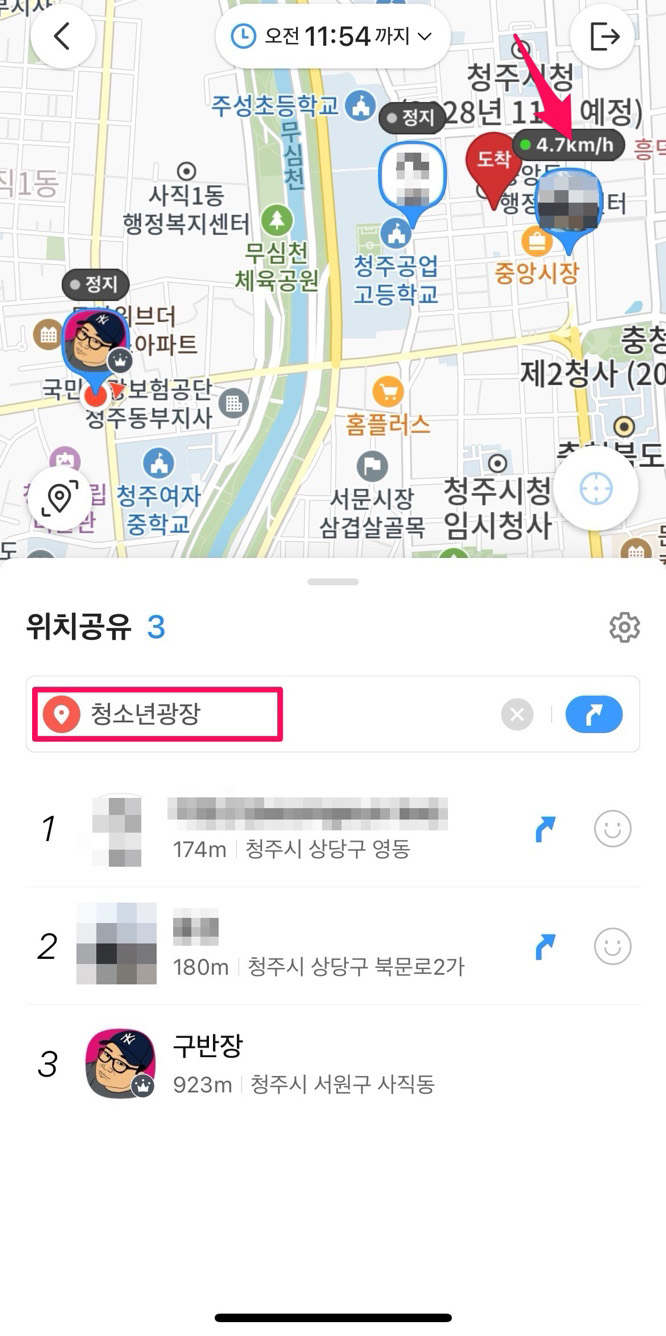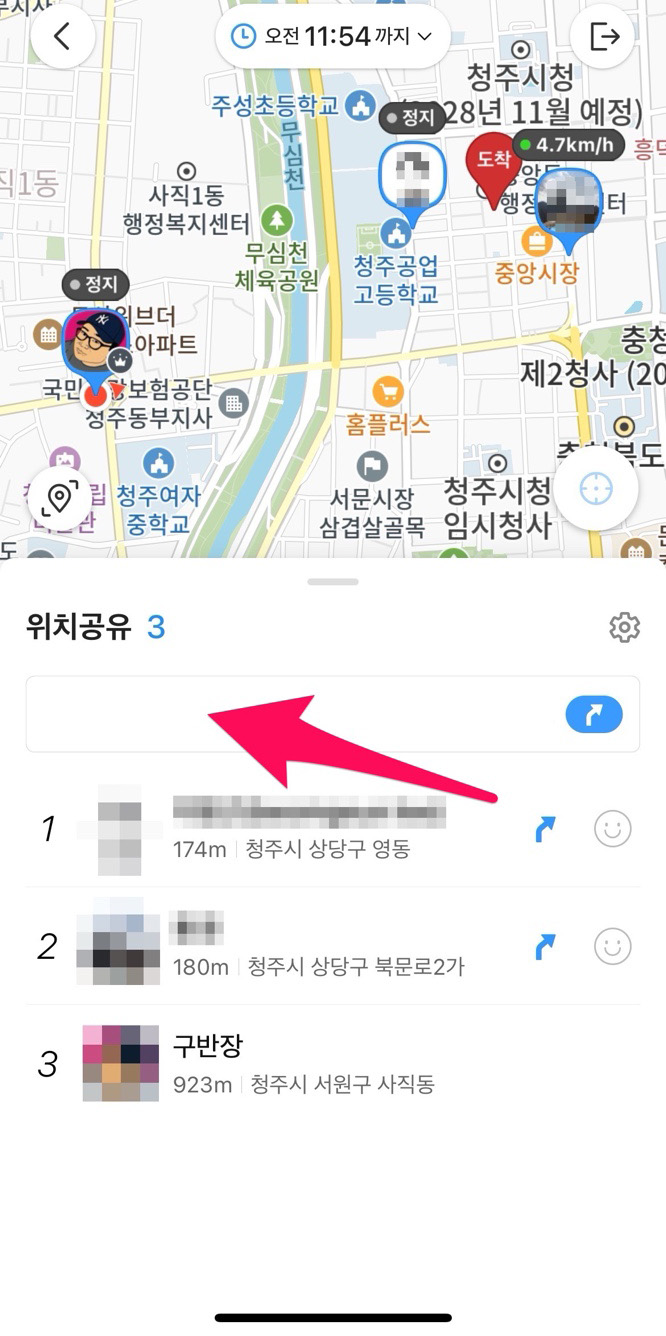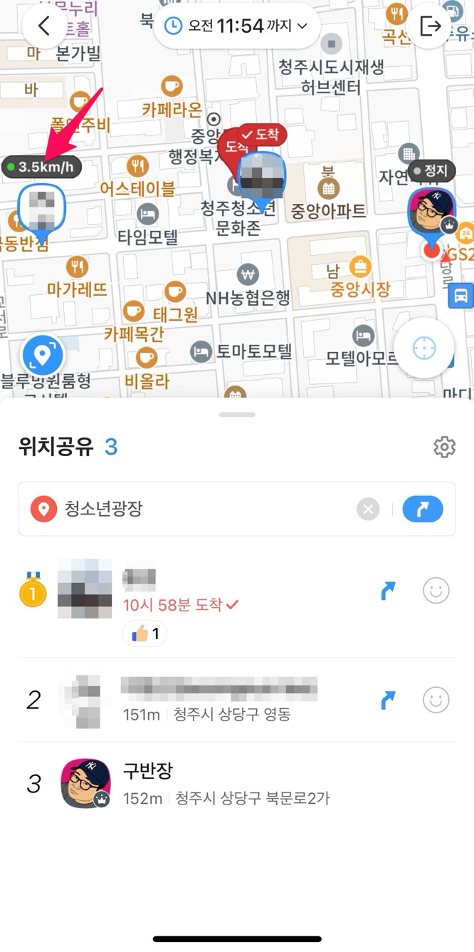 도착 장소까지 설정하면 도착 장소까지 각자 얼마나 남았는지 알 수 있습니다.