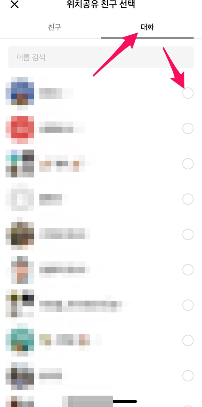 카카오맵을 열면 하단에 위치공유 메뉴를 선택한 후 위치공유 친구 선택에서 1:1로 하시던지 단톡방을 선택하면 됩니다.