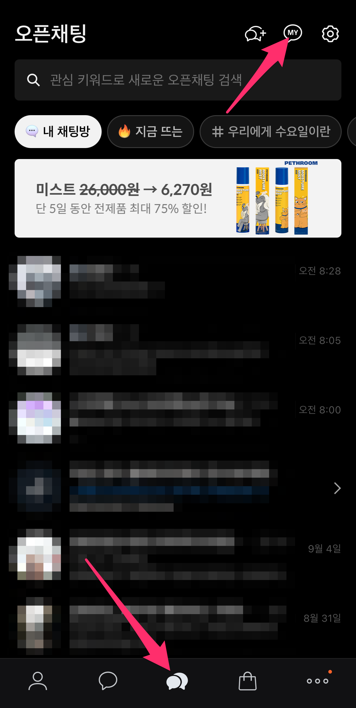카카오톡 하단 중앙에 오픈채팅 아이콘을 선택 후 오른쪽 상단에 MY 아이콘을 선택합니다.