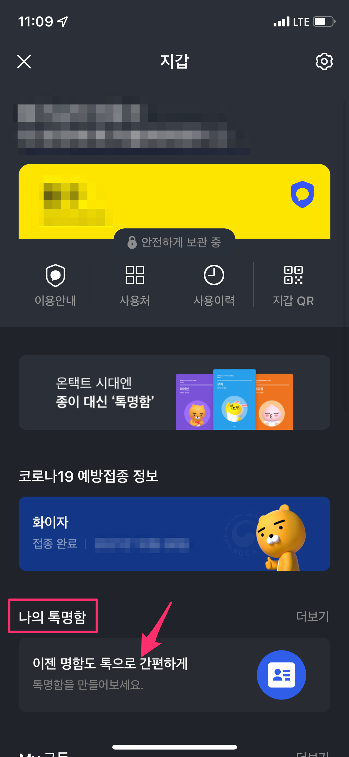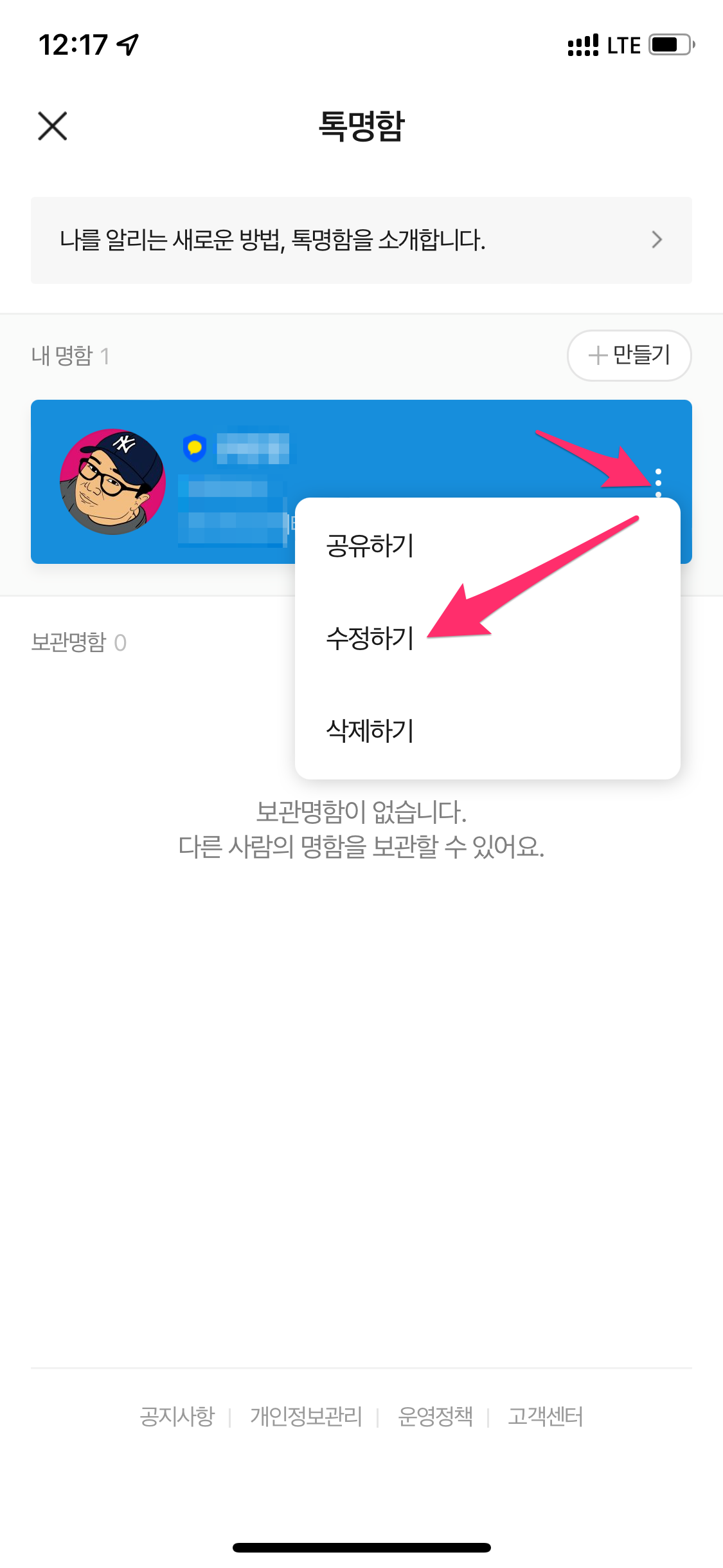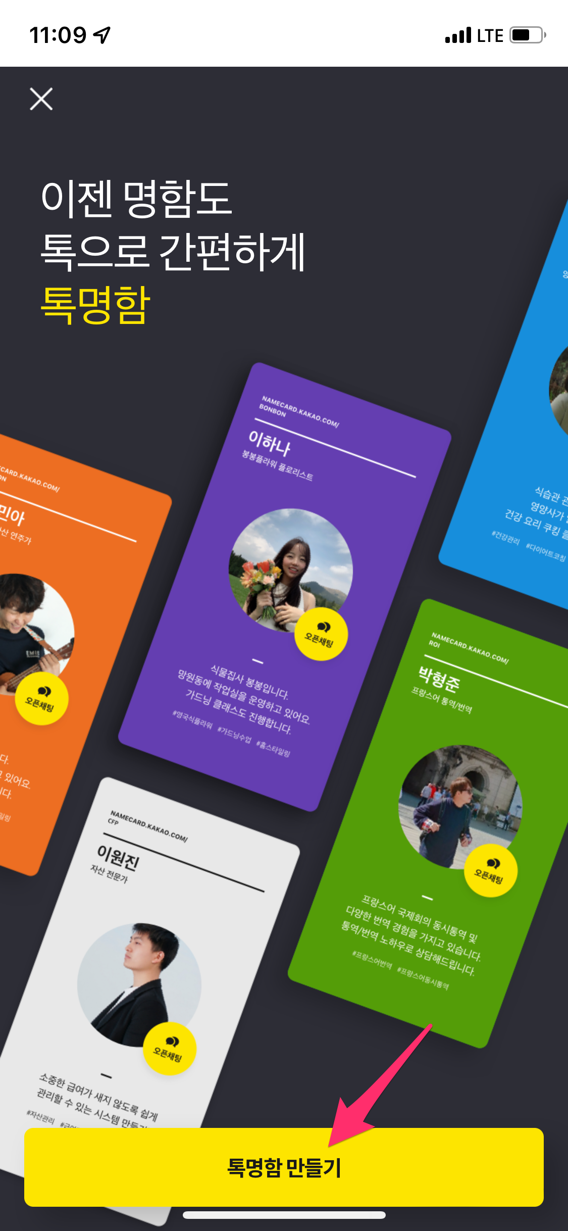 하단에 있는 나의 톡명함으로 들어가신 후에 톡명함 만들기 버튼을 선택합니다.