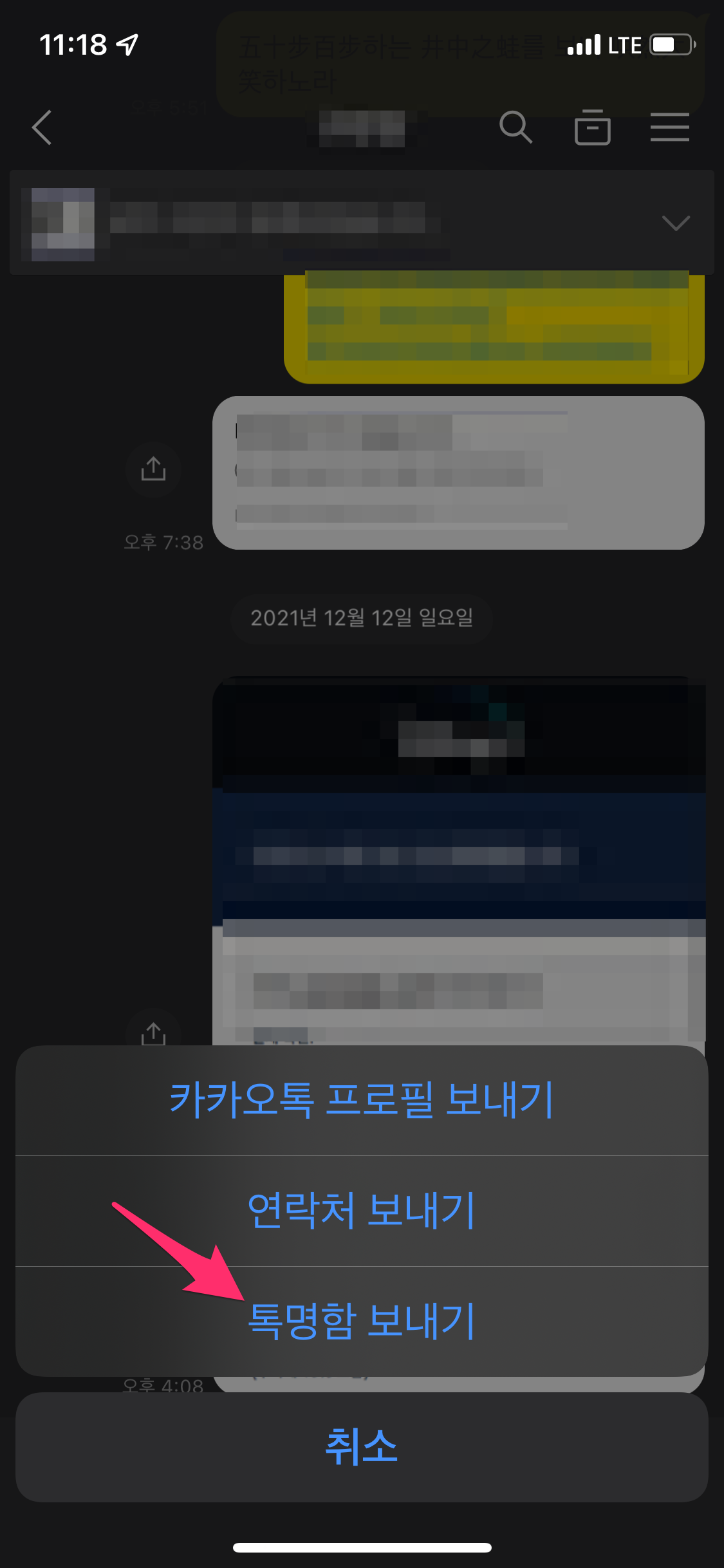연락처 버튼을 선택하면 나오는 메뉴 중에서 톡명함 보내기를 선택합니다.