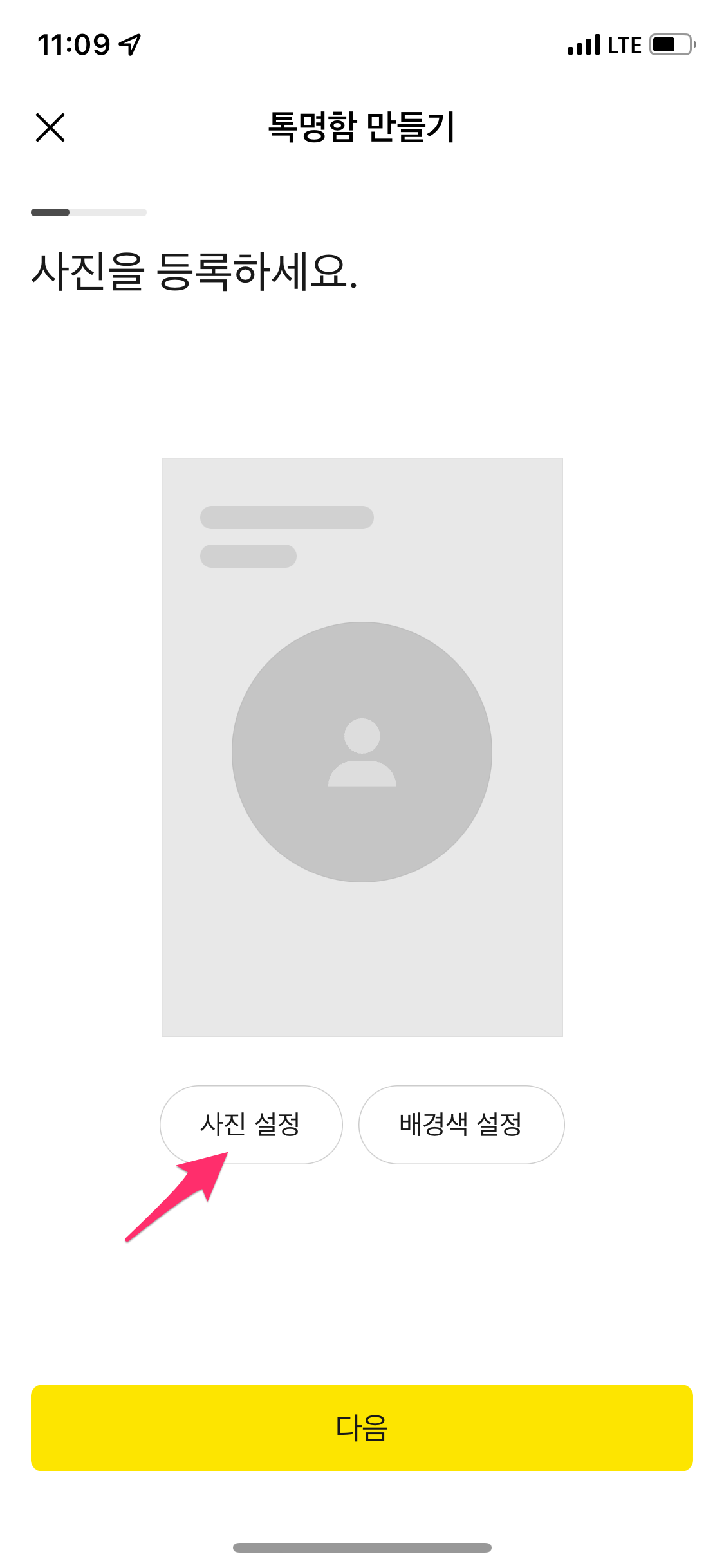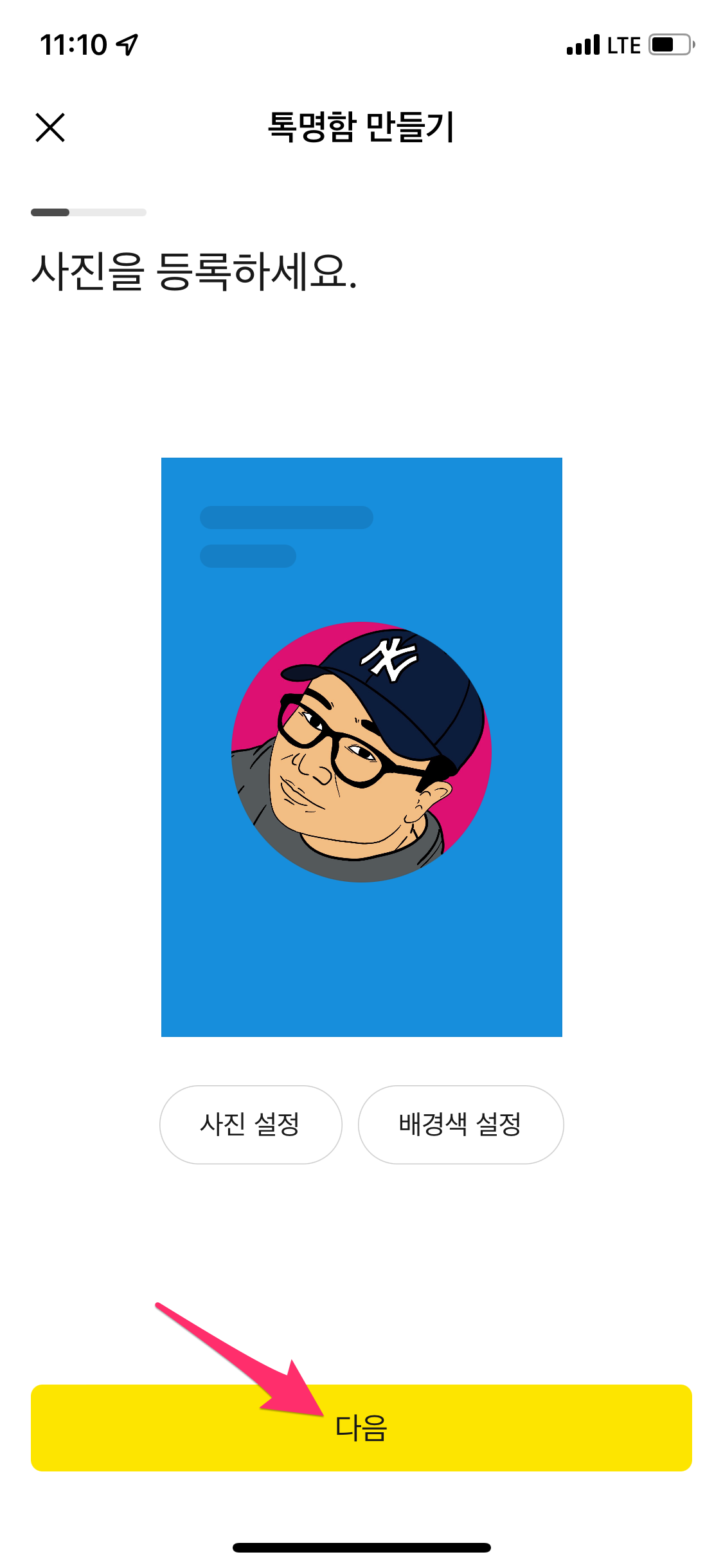이름, 직업, 전문분야, 명함 주소(아이디) 등을 입력한 후에 다음을 선택합니다.