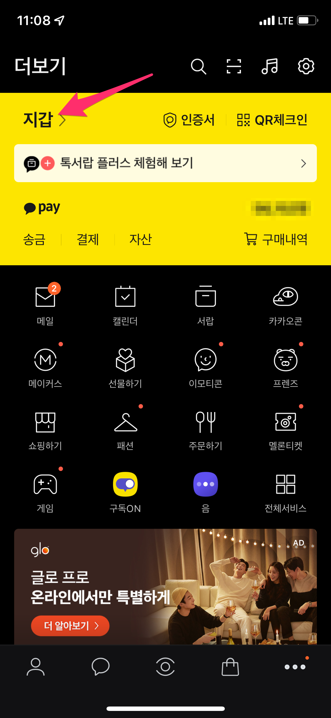 카카오톡 앱을 실행하고 오른쪽 하단에 점 3개 메뉴를 선택한 후에 지갑을 선택합니다.